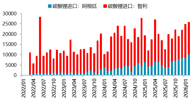 资料来源:SMM,一德有色 据中国海关数据统计,2月中国进口碳酸锂26427吨,环比减少2%,同比增加114%。其中,从智利进口碳酸锂1.5万吨,占进口总量的58%;从阿根廷进口碳酸锂10353吨,占进口总量的39%;从印尼进口碳酸锂270吨,占进口总量的1%。1-2月中国累计进口碳酸锂5.33万吨,同比增加64%。2月中国进口碳酸锂26427吨,环比减少2%,同比增加114%。其中,从智利进口碳酸锂1.5万吨,占进口总量的58%;从阿根廷进口碳酸锂10353吨,占进口总量的39%;从印尼进口碳酸锂270吨,占进口总量的1%。1-2月中国累计进口碳酸锂5.33万吨,同比增加64%。 图 3.9:碳酸锂进口(吨)