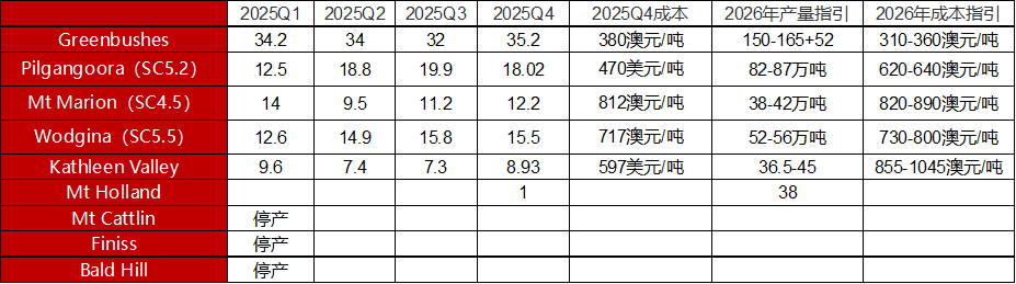 资料来源:Wind,一德有色 02 基本面:全球供需分析 2.1 海外矿山:非洲锂矿开采以及出口政策扰动不断 矿山季度财报数据显示,Greenbushes矿山2025年四季度生产锂精矿35.2万吨,环比增10%,同比减10%,其化学级精矿厂三期(CGP3)在2025年12月18日处理首批矿石;皮尔巴拉锂业锂精矿产量为20.8万吨,环比减少7%,同比增长11% ,推进了Ngungaju加工厂(年产能约20万吨)重启相关的准备和评估工作,对影响效率的破碎机进行升级,目前还未复产落地;Mt Marion矿山2025年四季度工厂进料量增加,锂精矿总产量16.2万吨,环比增长11%,同比增长40%,年度产量指引由32-36万吨上调至38-42万吨;Wodgina矿山2025年四季度生产了17万吨锂精矿,环比下降3%,同比增长57%,年度产量指引从44-48万吨上调至52-56万吨;Kathleen Valley矿山2025年四季度锂精矿产量为10.5万吨,环比增长21%。 澳矿目前看,如果不发生地缘政治因素引发的能源危机,矿山的产量总体是正常增加的。 表 2.1:澳矿2025年四季度财报