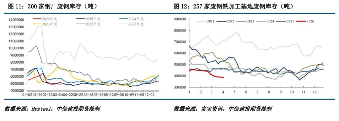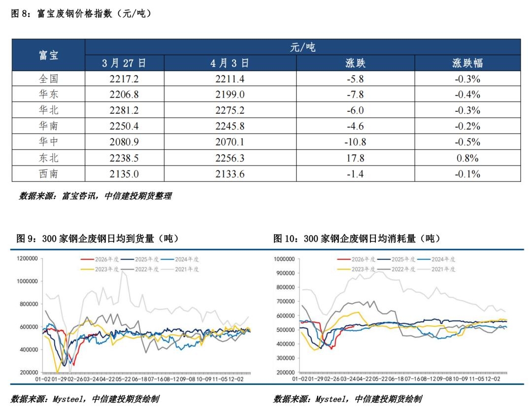 五、废钢:以稳为主 废钢废钢价格:本周富宝全国废钢价格指数下降。 废钢供需:根据钢联,受国际贸易及原油市场震荡影响,近期钢材价格窄幅波动。原料成本高企令钢厂盈利有限,控本意愿强烈,废钢因价高于铁水缺乏性价比,钢厂采购和使用意愿减弱。同时,废钢基地出货避险增加,钢厂库存上升,对价格形成压力。但电炉开工率回升带动需求,供应整体偏紧又支撑价格。综合来看,钢厂盈利未明显改善下,废钢仍处于被动控本阶段,预计近期价格主稳个跌。