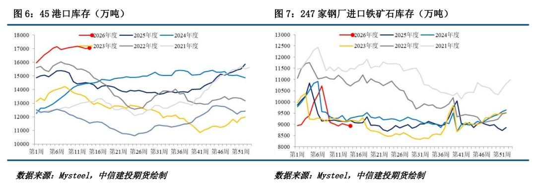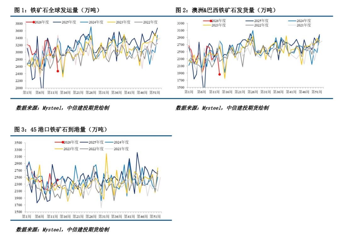 二、铁矿石供给:发运下降,到港增长 发运量远端供给:全球铁矿发运总量下降,澳巴发运总量下降。2026年3月23日-3月29日Mysteel全球铁矿石发运总量2472.4万吨,环比减少671.9万吨。澳洲巴西铁矿发运总量1875.1万吨,环比减少684.3万吨。澳洲发运量1033.8万吨,环比减少961.9万吨,其中澳洲发往中国的量839.2万吨,环比减少795.6万吨。巴西发运量841.4万吨,环比增加277.6万吨。 铁矿石到港量近端供给:到港总量增长,铁矿石近端供增长。2026年03月23日-03月29日中国47港到港总量2626.7万吨,环比增加243.6万吨;中国45港到港总量2426.3万吨,环比增加154.7万吨;北方六港到港总量1198.1万吨,环比增加147.7万吨。 铁矿国内供给下降,库存下降。截至4月3日,Mysteel统计全国186家矿山企业日均精粉产量46.14万吨,环比降1.07万吨,同比降2.87万吨。矿山精粉库存97.98万吨,环比降1.89万吨。