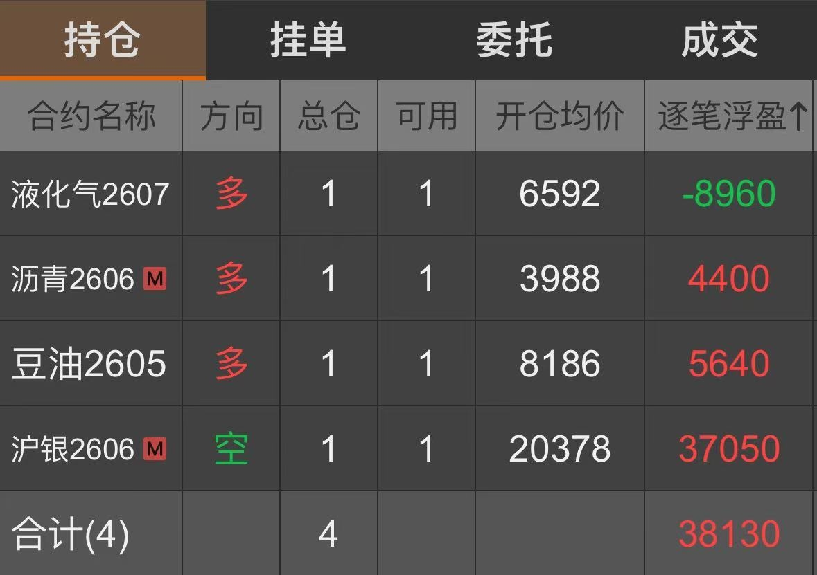 | 一、开仓总结 沥青:2026年2月25日,达到启动点的开仓条件,所以在14:50开多一手沥青2604合约,开仓价为3359。沥青2604合约于2026年3月12日14:41移仓至主力合约2606,开仓价为3988。 豆油:2026年2月26日,达到启动点的开仓条件,所以在14:45开多一手豆油2605合约,开仓价为8186。 液化气:2026年2月26日,达到启动点的开仓条件,所以在14:45开多一手液化气2604合约,开仓价为4557。液化气2604合约于2026年3月23日21:54移仓至液化气2607合约,开仓价为6592。 沪银:2026年3月17日,达到启动点的开仓条件,所以在14:56开空一手沪银2606合约,开仓价为20378。 二、平仓计划 沥青:达到启动点的平仓止损/止盈条件,在收盘前或下一个交易日开盘后全部平仓。 豆油:达到启动点的平仓止损/止盈条件,在收盘前或下一个交易日开盘后全部平仓。 液化气:达到启动点的平仓止损/止盈条件,在收盘前或下一个交易日开盘后全部平仓。 沪银:达到启动点的平仓止损/止盈条件,在收盘前或下一个交易日开盘后全部平仓。 注:本交易总结由第三方提供,只作为投资理念和方法的交流,不作为七禾网的观点,也不作为投资参考和建议。 附: 1、交易者简介 十年股票/期货/外盘交易经验,每年都实现投资盈利。 擅长微观盘面分析和宏观市场分析,总结了数套有效的盈利模式,和众多高手有深入交流,收益良好。 2、持仓截图