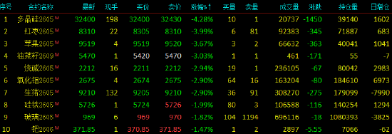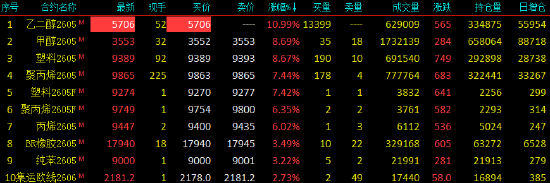 | 2026年4月7日,国内期货主力合约涨跌不一,乙二醇封涨停,甲醇、塑料涨超8%,聚丙烯涨超7%,丙烯涨超6%,纯苯、BR橡胶涨超3%。跌幅方面,多晶硅跌超4%,红枣、苹果、油菜籽跌超3%,烧碱、氧化铝、生猪跌超2%。