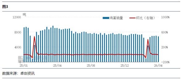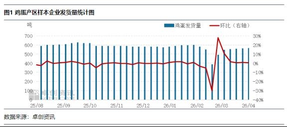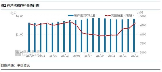 蛋鸡存栏量高位微涨,鸡蛋供应充足。3月新开产蛋鸡主要对应2025年11月前后补栏的鸡苗,该阶段养殖环节补栏意向略有好转,鸡苗补栏量增加,因此3月新开产蛋鸡数量略有增加。3月养殖单位惜售情绪提升,月内老母鸡出栏量不足,导致4月新增产能略高于淘汰产能,在产蛋鸡存栏量环比涨幅0.30%。4月鸡蛋市场整体供应处于充足局面,一定程度上利多鸡蛋发货量。
