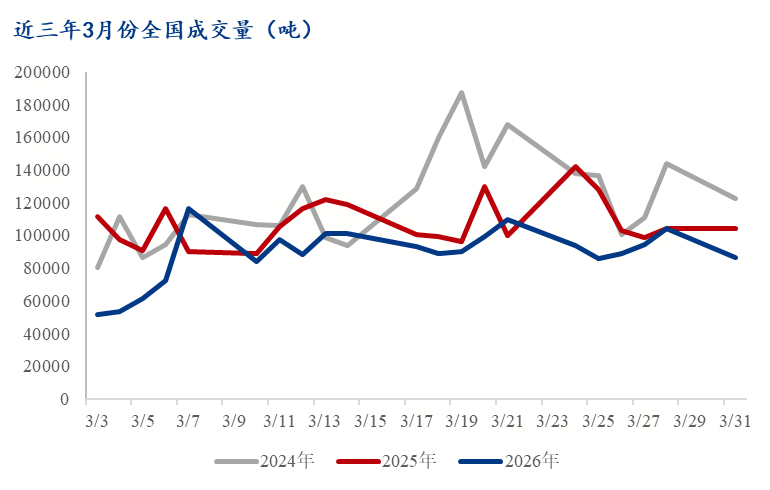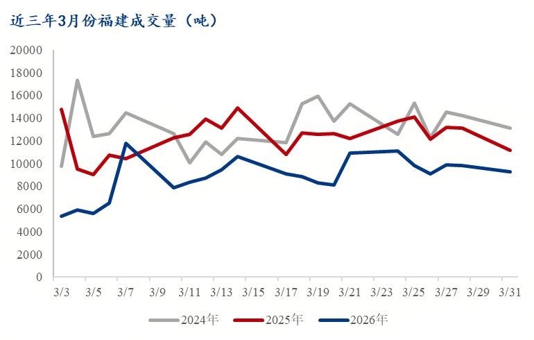 二、成交 首先我们来看全国建筑钢材成交量(237家样本),2024年3月份全国成交量均值维持在12万吨,2025年3月份减少至10万吨,今年3月份更是减少至8万吨水平,同比2024、2025年分别下降27.22%和17.73%,降幅明显。拆解今年3月份每日成交数据来看,3.9、3.13、3.16、3.23和3.30五日的成交量突破10万吨,而这几日中除3月16日外均为全国普涨,一定程度上刺激了市场交投活跃度。其余天数,全国每日成交量维持在8、9万吨水平。虽然这个成交量水平已经较节前明显恢复,但对比往年,它确实无力支撑价格上涨。2025年3月,8万吨水平仅有1天,9万吨水平也仅有7天,其余均为10万吨以上,甚至出现了峰值为14万吨,而2024年3月中,15万吨以上水平还出现了3天。 接着回归区域,我们来看一下福建区域建筑钢材成交量情况(30家样本),2024年3月份均值维持在1.32万吨,2025年3月份减少至1.23万吨,今年3月份直接减少至0.87万吨水平,同比2024、2025年分别下降33.7%和29%,降幅比全国更明显。2024年3月,仅有1天成交量在1万吨以下,到了2025年3月增加至2家,而到了今年3月,成交量在1万吨以上的仅有4家,下降明显。即便考虑到春节错峰因素,这个数字下降的也是异常明显。 价格与成交量形成负反馈:价格偏弱运行,是交投不活跃、成交减量的一个缩影,同时成交量持续走低也直接制约价格反弹空间。