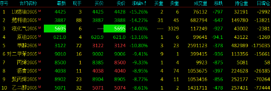 | 2026年4月8日,国内期货主力合约跌多涨少,液化气封跌停,低硫燃料油(LU)跌超15%,燃料油跌超14%,SC原油跌超13%,甲醇跌超10%,PX0>对二甲苯、丙烯跌超9%,沥青、聚丙烯、乙二醇跌超8%。涨幅方面,沪银涨超5%,沪锡涨超4%,油菜籽、钯、铂涨超3%,沪金涨超2%。