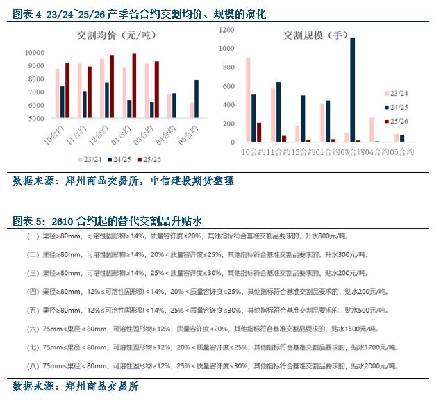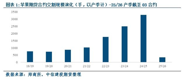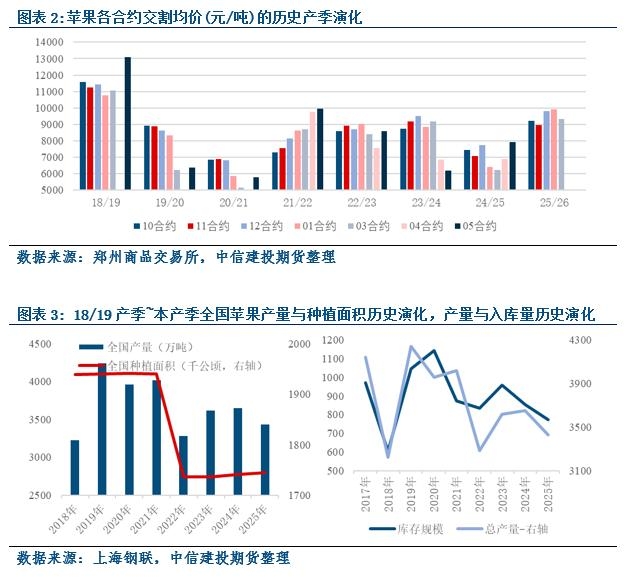 | 背景:本文意在基于公开信息,对比分析26/27产季(2610起的苹果合约)可能会与往年苹果期货有什么变化。 苹果期货供给侧矛盾的分析: 讨论的核心在于能否在合约交割时快速整理出数量、成本上合适的交割品。关键变量是分为产量与质量。按苹果生长周期特点,市场往往在上半年集中交易产量预期,下半年集中交易质量预期: 3到6月经过花期、坐果期、套袋三个环节往往能大致确定各主产区产量。 在“夏季的膨大期(怕干旱缺水)至9~10月的下树期(怕连绵阴雨、冰雹等影响表面)”的期间内,市场往往集中围绕主产区货源质量进行交易。 而结合期货实物交割来看,产量往往会通过影响供需平衡(宏观)、果农、客商收购博弈时的心态(微观),从而影响全国各产区各类货源的价格重心---制作交割品的基础收购成本。 质量则在好货收购成本、整理耗时、打残费用等多方面影响了产业制作交割品所需成本。若交割所需成本偏高,则产业的交割能力、意愿往往会偏低。具体来说,若质量不佳,则产业参与交货时需要承担制作交割品的高成本风险及无法通过各类质量检测等风险。而在此类情景中,市场参与者接货意愿通常较高,对交货方要求更高。若参与者倾向于使用某个或某几个特定产区的货源制作交割品,则此类产区的减产将较其余产区更显著提高交割品的收购、整理成本。故市场对于某一部分产区的天气情况可能显得更为敏感。 综上,若更多产区货源能被用于制作交割品,则产业参与交割意愿/能力将明显提升,对于该年度局部产区各类突发天气影响自然也有了更高的鲁棒性,反之亦然。 理解了前述逻辑,我们也更容易理解18/19产季~25/26产季的以下现象。 1. 18/19产季至21/22产季中期货交割规模缓慢上升(21/22产季起新挂牌04合约)。其中,18/19(减产),21/22(下树期西部优生产区遭遇冰雹、质量偏差)产季的各合约交割均价呈contago结构;19/20,20/21缺乏类似矛盾,呈back结构(图表1、2)。 2. 22/23~24/25产季中交割规模快速上行,而在25/26产季回落至偏低水平(图表1)。22/23产季本身有着西北主产区减产影响。而23/24、24/25产季中合约交割均价与交割规模呈一定负相关性(入库量上,24/25产季低于23/24产季)。 从主力10、01、05合约来看,24/25产季价格在10、01合约上明显低于23/24产季,交割规模则显著更高,05合约则反之。 这一反差也伴随着2504、2505合约交割量的快速下降。25/26产季可以说延续了2505合约的交割特点,并叠加了该产季供给侧要素共振。(图表2、3、4) 3. 在22/23~24/25产季这一时间段中,除了交割机构调整之外,2023/11/1的《关于发布苹果期货业务细则修订案的公告》中将交割品的替代升贴水品增加至四档(2411合约起生效)。而25年8月公告了适用于2610及后续合约的替代交割品升贴水(图表5)。 由于当前时间尚早,我们暂时无法对26/27产季(2610合约~2705合约)苹果的产量、质量给出任何结论。单从4月上旬的情况看,各产区花量可能较为充足,而当前天气预报内容较为平稳(图表6)。 暂时抛开供给侧,26/27产季合约较之25/26产季合约最直接的变化是2025/8/29发布的《关于发布苹果期货替代交割品升贴水的公告》中,将替代升贴水品自四档增至八档,这一变化理论上能使更多潜在货源参与交割品的制作。 综上所述,我们认为10合约于3月底以来的快速下行格局大致由两大要素推动:1.2510~2605合约高交割均价影响下相较于历史产季相对偏高的价格;2.当前生长期天气平稳,可能构成一定丰产预期。目前场内期权持仓量最高的是AP2610C10000与AP2610C10200。可关注近期偏宽松预期潜在的进一步发展及未来的调整机会。