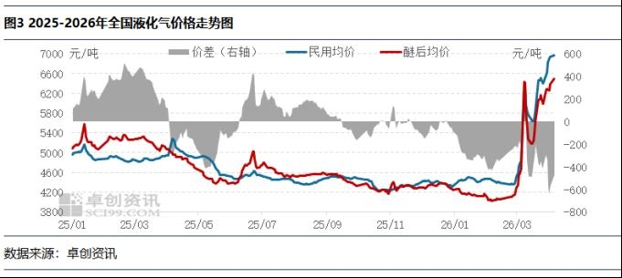 | 【导语】3月国内液化气市场在低库存与地缘局势紧张的双重支撑下,价格呈现易涨难跌特征。炼厂库容率月末降至25.95%,较上月末下降4.73个百分点;月末主港库容率35.89%,环比微升1.71个百分点。进入4月,随着美以伊三方达成临时停火共识,地缘溢价逐步回吐,液化气市场面临回调压力,但低库存环境仍为价格提供一定底部支撑。 需求阶段性释放主导库存波动 3月LPG炼厂库容率先升后降 2026年3月国产液化气炼厂库容率呈现触底回升、而后震荡走低的走势特征。截至3月27日统计数据显示,LPG炼厂月末库容率为25.95%,较上月末同期相比,下降4.73个百分点。 2026年3月国内液化气商品量预估值为168.48万吨,环比增加6.81%;日均商品量为54347.6吨(2月为56331);总量提升,但日均商品量有所下滑。从需求角度来看,3月国内液化气市场需求与库存呈现清晰的阶段性负相关关系,上旬受地缘局势紧张刺激,下游备货积极,需求集中释放,库存显著下降。中旬价格高企抑制接货意愿,需求跟进不足,库存由降转升。下旬局势再度紧张,刚需及避险采购回暖,需求边际改善,库存重回去化通道。总体而言,需求节奏直接主导了库存波动方向,两者反向联动特征明显。 到港量增加叠加需求疲软 3月进口气库容率环比升高 进口气库容率方面,截至3月26日统计数据显示,本月末国内主港平均库容率为35.89%,较上月末均值升高1.71个百分点。 截至3月26日监测数据显示,本月国内主港码头VLGC到港量(含预计到港量)约262.57万吨,预计较2月实际到港量增加42.77万吨。华南合计到港量79.87万吨,华东112.3万吨,山东59万吨,东北9.2万吨,华北2.2万吨。美国码头装船恢复正常,对进口形成支撑,3月货物贴水下降激发采购热情,叠加港口库存偏低,交易较为活跃。但受中东局势紧张影响,霍尔木兹海峡通行受阻,3月下旬中东某国船只出港稀少,进口量明显下滑。从需求角度来看,3月国内丙烷市场需求整体疲软,燃烧刚需有限,PDH开工负荷低位,实际需求跟进不足。但由于港口库存持续处于低位,上游挺价心态较强,叠加地缘局势紧张引发的减供预期,阶段性补库需求仍有释放。价格高企后下游抵触情绪滋生,采购放缓,但低库存环境缓冲了价格下行压力,市场呈现“弱需求、低库存”的博弈格局。