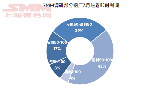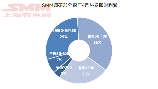 数据来源:SMM 利润方面 据SMM调研的钢厂生产热卷即时利润情况来看,当前多数钢厂即时利润集中在盈利50-100元区间,样本钢厂盈利率较上月初有所提升;细分来看,约3%的钢厂反映当前利润亏损>100元/吨,约7%的钢厂反映当前利润处于亏损50-100元/吨;29%的钢厂处于盈亏边际平衡状态;36%的钢厂反映当前利润处于50-100元/吨区间;25%的钢厂反映当前利润>100元/吨。 图5:SMM调研部分钢厂近2月热轧即时利润情况