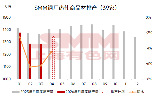 数据来源:SMM SMM热轧排产:4月热轧排产环比增5%,日均增9% 据SMM最新跟踪显示,39家热轧板卷主流钢厂本月热轧商品材计划量总计1344.8万吨,较上月实际热轧商品材产量上升63.55万吨,增幅5.0%。 日均来看,4月天数较3月少1天,4月热轧商品材日均排产为44.83万吨,环比上月实际日均产量上升8.5%。 图2:SMM钢厂热轧商品材计划量与实际产量