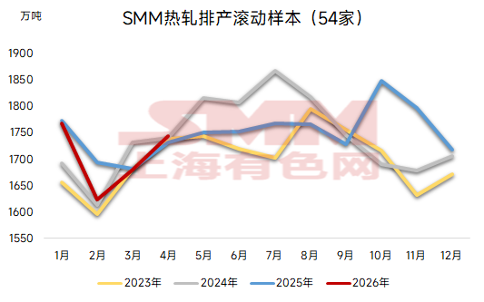 本月,SMM样本扩充后的54家钢厂热轧商品材计划量总计1743.3万吨,较上月实际产量上升5.7%。 日均来看,4月天数较3月少1天,4月54家钢厂热轧商品材日均排产为58.11万吨,环比上月实际日均产量上升9.2%。 图3:SMM钢厂热轧商品材计划量(滚动样本)
