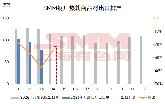 数据来源:SMM 3月,东北、华北、华东、中西部等多家钢厂高炉或轧线检修,叠加环保限产影响,部分钢厂降负荷生产,而随着检修结束陆续复产,4月钢厂热卷产量出现明显回升。 分内外贸看 内贸:本月热轧板卷内贸排产1259.7万吨,环比上月国内实际产量增加56.85万吨,增幅4.7%,日均内贸排产环比增8.2%。据SMM调研,当前钢厂接单已基本接满,部分钢厂反映3月下旬接单压力环比中上旬有所抬升。 外贸:本月热轧板卷出口计划量85.1万吨,较上月实际出口上升6.7万吨,环比增幅8.5%。 本月国内钢厂热轧出口计划量环比小幅回升,区域情况来看,东北钢厂出口计划量小幅下降,华北、华南钢厂出口计划量小幅增加,华东及其他市场钢厂出口计划量基本持稳。 新接订单方面,据SMM最新调研了解,受海外地缘冲突影响,近期钢坯出口接单情况较好,而热卷新订单情况相对一般,钢厂对钢坯生产积极性明显抬升。 图4:SMM钢厂热轧出口计划量与实际出口