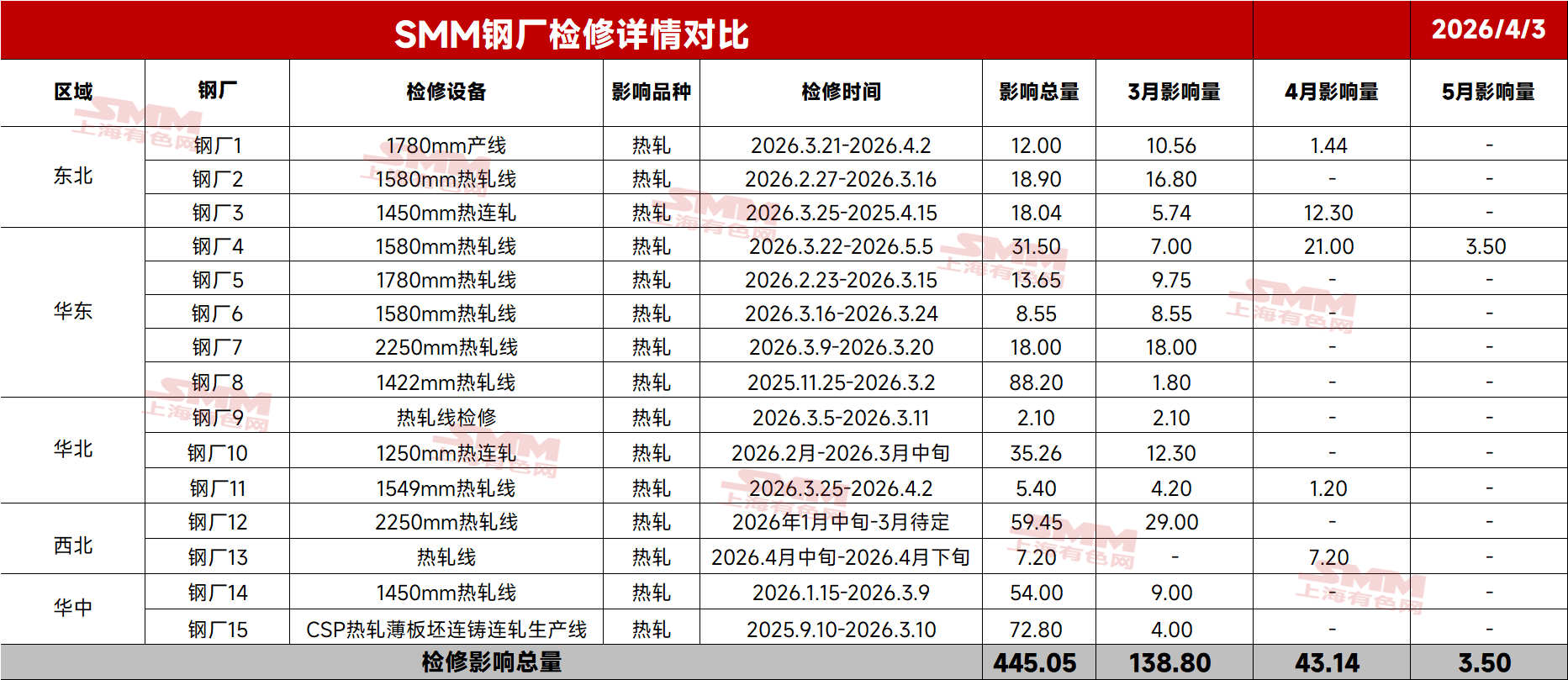 数据来源:SMM 检修方面 4月热轧检修影响量暂为43.14万吨,环比上月下降95.66万吨。目前发布的检修集中于东北、华东及西北等区域,后续情况SMM将持续跟踪,具体检修明细见下表: 表2:SMM钢厂热轧检修