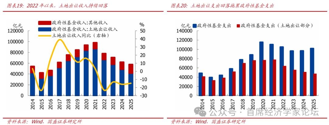 3、土地财政:房地产市场表现偏弱,叠加新政约束,可能继续承压 近年来,土地财政下滑明显,对广义财政收支形成约束。土地财政是第二本账政府性基金收入最主要的来源,土地出让收入占政府性基金收入比重2020年一度来到90%。但近年来,伴随房地产市场走弱,土地出让收入持续下滑,地方土地出让收入从2021年高点的8.71万亿回落至2025年的4.15万亿,拖累政府性基金收入从高点的9.8万亿回落至5.77万亿、将近腰斩。由于第二本账以收定支,伴随收入端的下滑,政府性基金中土地出让收入安排的支出也逐步回落,2021年以来已经连续4年回落,拖累广义财政支出。