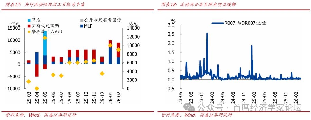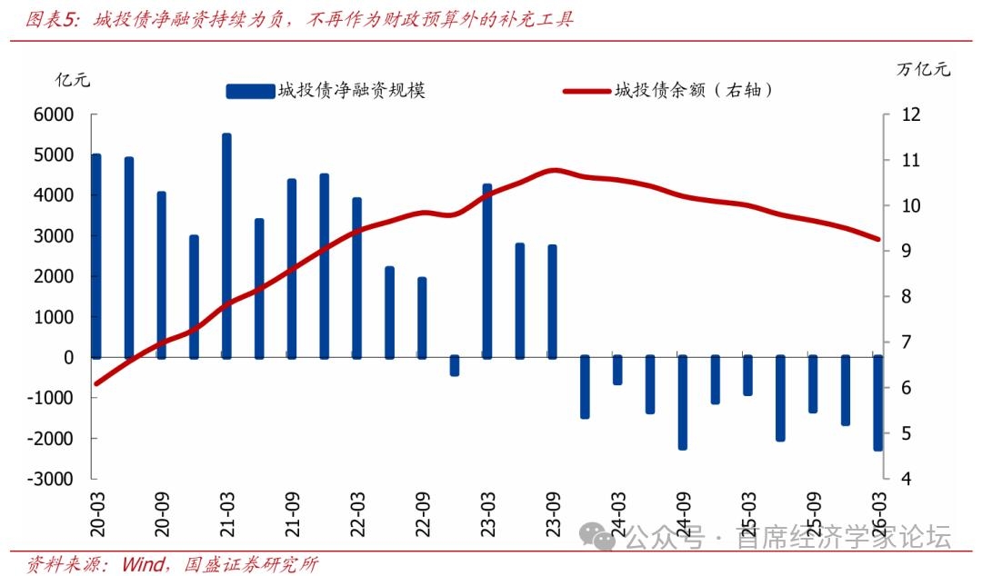 预算外,准财政工具力度为历史最大、节奏也明显前置,城投融资约束仍强。政策性金融工具是近年来使用较多的准财政工具,今年政策性金融工具与过往主要有两点差异:一是规模上来看,本轮政策性金融工具规模为8000亿,明显高于前两轮(2022年7399亿、2025年5000亿);二是节奏上来看,过往政策性金融工具一般在下半年根据经济情况“空中加油”,但本轮政策性金融工具在年初就披露,节奏明显快于过往,释放了政策有意托底经济、力争实现“十五五”开门红的信号。除此之外,城投融资也是过去财政的重要补充资金来源,但近年来监管约束持续加强,城投融资或将完全退出准财政工具箱。从数据上来看,城投债净融资自2023年Q4以来已经连续10个季度净减少,目前存量城投债规模也从高点的10.8万亿逐步回落至当前的9.3万亿附近。