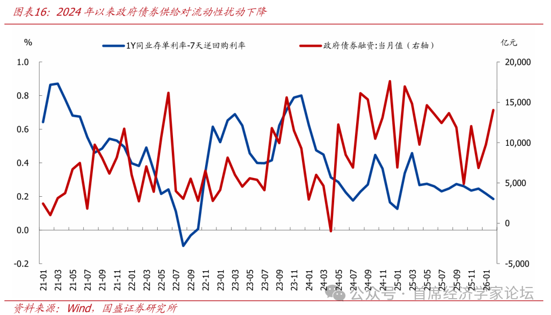 2、流动性:央行调控更加精细化,流动性扰动可控 2024年以来,伴随资产荒格局加剧,政府债券供给对流动性扰动下降,甚至出现政府债券多发阶段、市场流动性转松。债券供给对与流动性的扰动一直是市场关注的重点,但这一担忧在资产荒格局下似乎有所缓解。我们用1Y同业存单收益率与7天逆回购利率之差来反映市场流动性的松紧,2021-2023年1Y同业存单收益率-7天逆回购利率方差和均值分别为0.058、0.492,而2024年至今两者分别为0.014、0.281,指向市场流动性的波动下降、边际收紧程度缓解。同时,从相关性上来说,2021-2023年政府债券供给与1Y同业存单收益率-7天逆回购利率的相关性为0.06,但2024年至今相关性为-0.3,也即当前政府债券多发阶段、市场流动性反而是转松的。