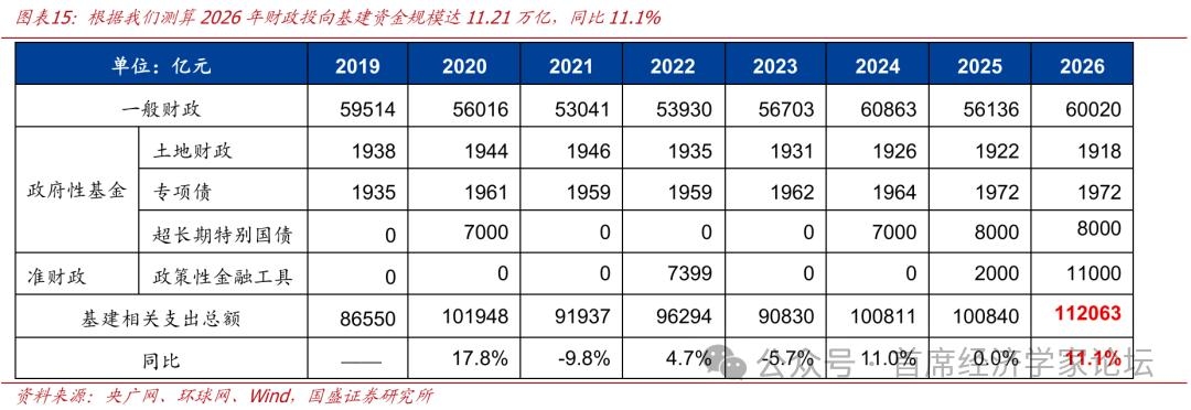 全年资金总量上来看,基建安排的相关资金增速有望创2020年以来次高水平,且撬动杠杆能力增强,有望支撑基建增速逐步修复。根据我们测算,2026年财政两本账+预算外准财政,预计可为基建提供11.21万亿左右的资金,同比11.1%、是近年来次高水平。同时,政策性金融工具规模可观、达1.1万亿(包括8000亿今年新增,假设2025年三季度末开始增发的5000亿政策性金融工具中有3000亿在2026年落地)。且这部分资金撬动杠杆能力较强,参考过去经验,撬动杠杆比例在10倍以上,有望支撑基建投资增速逐步修复。