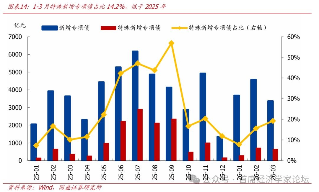 二、执行细节:关注基建实物工作量、流动性冲击、土地财政表现 1、基建资金来源同比大幅多增,实物工作量形成有望改善 从1-2月数据来看,财政对基建的支持是“真落地”,而非纸面发力。如前所述,一般财政支出明显提速、支出进度也快于季节性,其中基建相关支出增速同比也由负转正至2.1%、此前连续8个月同比负增,指向财政并非只是在预算口径上“积极”,而是在现金流和项目支付层面已经明显前置。值得注意的是新增专项债中,用于化解存量债务的占比较低、1-3月特殊新增专项债占比仅14.2%,这与2025年部分时期“化债分流新增投资资金”的情形不同,2026年开年的新增资金对新项目建设的拉动更强。
