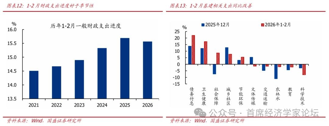 从一般财政预算披露的支出结构来看,也基本符合上述主线,民生相关支出占比继续抬升。根据披露数据,2026年一般财政支出预算中,民生相关支出占比48.1%、相较2025年抬升4.5个百分点。其中,文体传媒支出占比抬升幅度最大、达3.9个百分点,卫生健康、社会保障、教育、科学技术相关支出占比也均有不同幅度抬升。基建相关支出占比21.2%、较2025年底小幅回落0.4个百分点,城乡社区事务、农林水、节能环保、交通运输相关支出占比均不同幅度回落。