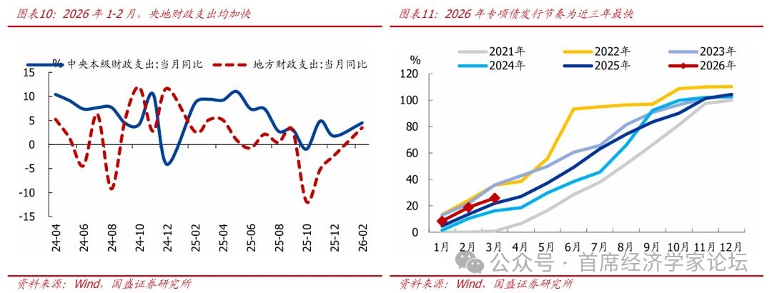 3、支出节奏:前置发力,政府债券供给高峰可能在二季度 政策定调积极,要求财政靠前发力,尽快形成实物工作量。预算草案中明确指出,财政政策实施过程中,要“注重靠前发力,尽早谋划政策,加快落地执行,不拘常规节奏,以尽早行动争取工作主动”,强调“推动资金尽快到位、政策尽快落实、项目尽快落地”。 从1-2月数据来看,财政靠前发力迹象明显,后续有望进一步加快,政府债券供给高峰可能在二季度。财政支出角度来看,1-2月一般财政支出4.67万亿,同比3.6%、较上年底抬升5.4个百分点。从支出进度来看,1-2月一般财政支出占全年比重为15.6%,也快于季节性(近三年同期均值为15.3%)。结构上看,中央财政支出同比4.5%、较上年底抬升2.8个百分点,地方财政支出增速由负转正至3.5%。政府债券发行进度来看,截止3月底,专项债新券累计发行1.16万亿,占全年比重为26.4%、发行节奏为近三年最快。往后看,财政靠前发力要求下,政府债券供给高峰可能在二季度。