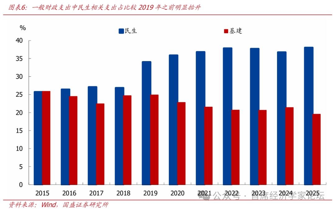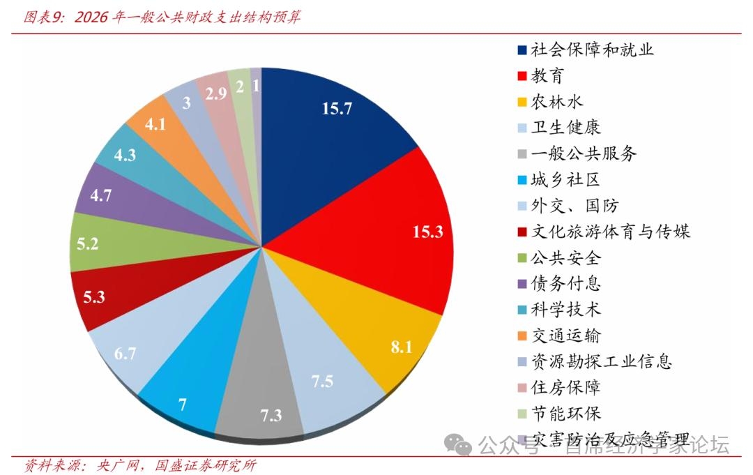 2、支出投向:从“稳增长”到“稳增长、防风险、调结构”并重 过去财政更多作为逆周期调节工具,更加注重稳增长、托底经济,主要发力抓手是基建扩张。但近年来,财政思路逐步转向“稳增长、防风险、调结构”并重,在逆周期调控的同时、也开始注重跨周期调节,投资于人、债务化解、高质量发展等重要性更加突出。具体来看,主要有5条主线: 主线一:扩内需继续保持最高优先级,补贴范围从过去的商品消费拓展至服务消费,补贴模式也从“直补”优化至“补消费能力+补消费场景+补服务供给”。2025年以来的预算草案中,扩内需(2025年“支持扩大国内需求”、2026年“支持建设强大国内市场”)连续两年位于财政政策首位,财政支出不再只是为投资托底,更明确承担提振消费、改善居民预期、增强终端需求的功能。具体安排上来看,超长期特别国债中安排2500亿元用于支持消费品以旧换新,2000亿元用于大规模设备更新,另设1000亿元财政金融协同促内需专项资金,通过贷款贴息、融资担保、风险补偿等方式支持扩大内需。补贴范围上,从商品消费逐步向服务消费、场景消费和下沉市场消费延展。多措并举之下,财政对消费的支持从过去的“直补”消费,逐步拓展到“补消费能力+补消费场景+补服务供给”。 主线二:“投资于人”进一步强化,民生相关支出占比有望创历史新高。预算草案明确指出,要将“投资于物和投资于人紧密结合”,并“加大保障和改善民生力度”。政府工作报告中,已经明确今年将“城乡居民基础养老金月最低标准再提高20元”、“居民医保人均财政补助标准提高24元”、“继续推动免费学前教育等政策落地”、“稳岗扩容提质行动、以工代赈投资规模增加”等。从数据上来看,民生相关支出占比较2019年之前明显抬升,2025年一般财政支出中民生相关支出占比为38%、为有数据以来最高水平,今年政策推动下民生相关支出占比有望创历史新高。