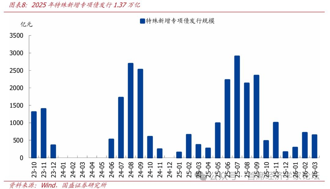 主线四:传统基建不是消失,而是转向“有效投资、重大项目、实物工作量”,更加注重结构与效率。传统基建也是扩内需的重要一环,财政预算草案继续强调要“着力扩大有效投资”。但与过往“大水漫灌”式投资不同,本轮扩基建更加注重结构与效率:一方面,强调要“聚焦新质生产力、新型城镇化、人的全面发展等重点领域,提高投资质量和效益”;另一方面,继续向“项目准备充分、资金使用得好的地方倾斜”、“提高项目成熟度和可执行性,避免资金闲置沉淀、挤占挪用”。在具体安排上,一是拟安排中央预算内投资7550亿元,较2025年增加200亿元;8000亿元超长期特别国债继续用于“两重”建设;新型政策性金融工具提升至8000亿元。二是专项债用途更强调重大项目、隐性债务置换、清欠账款,并提出“单列并提高用于项目建设的地方政府专项债券额度”。 主线五:化债、清欠与增强地方可用财力,仍是财政投向的“隐性主轴”,旨在防风险、修复财政传导。防风险在财政政策框架中的重要性持续提升、成为财政投向的“隐性主轴”,今年预算草案中明确指出专项债用于“置换隐性债务、消化政府拖欠账款”。从2025年的数据来看,新增特殊专项债规模为1.37万亿、高于此前安排的8000亿,指向化债仍是财政发力的重要方向、且力度有继续加码的可能。化债资金安排主要有两点考量,一是清偿隐性债务,降低债务成本、防范债务风险;二是缓解地方财政压力,修复财政传导,避免地方现金流和负债结构压力制约财政落地效果。