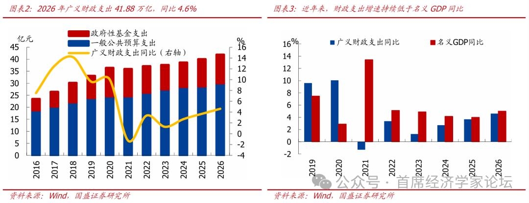 支出总量上,广义财政支出增速创近六年新高;但由于财政支出增速持续低于GDP增速,财政支出对GDP支持力度为近年来最弱。从预算角度来看,2026年广义财政支出预算为41.88万亿,同比4.6%、为2021年以来最高增速。主要有两点原因:一则上年一般财政支出未完成年初预算,基数相对偏低,2025年一般财政实际支出增速仅1%、为2022年以来最低水平;二则预算对于政府性基金收入预期可能相对乐观,政府性基金收入预期5.81万亿、同比0.6%,也即对土地财政预期与上年持平,但从近年政府性基金收入完成情况来看、预算完成难度较大。从占GDP比重的角度来看,预算口径下,广义财政支出占GDP比重为28.4%,连续6年回落、也是近年来首次回落至30%以下;实际口径下,近年来广义财政实际支出占GDP比重也呈逐步下滑的趋势。这种占比主要有两方面原因,一是土地财政走弱、宏观税负下降,导致收入下滑、拖累相关支出;二是政策导向上更加注重“投资于人”,基建支出增长放缓。