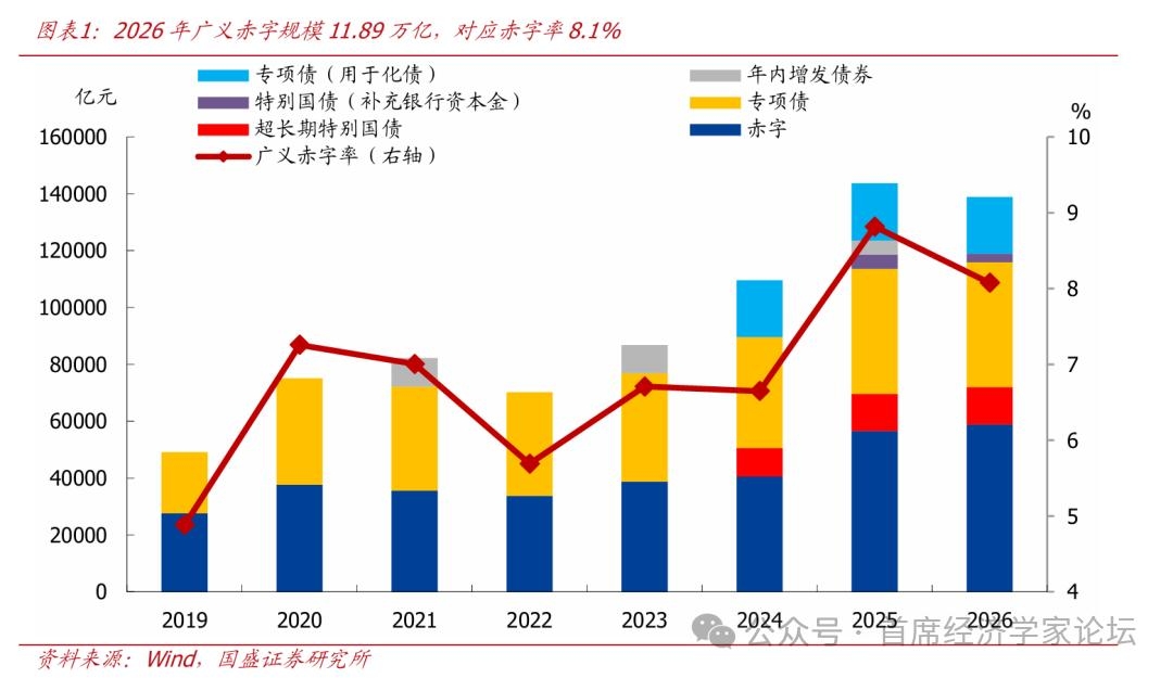| 一、财政预算:保持必要支出强度,兼顾稳增长、防风险、调结构,节奏前置 1、支出强度:赤字规模与上年基本持平,准财政节奏、规模超预期 赤字方面,广义赤字规模为11.89万亿、与上年预算基本持平,对应赤字率8.1%、较上年小幅回落。2026年财政继续保持必要支出强度,预算内赤字安排基本符合预期,广义赤字规模11.89万亿、与上年预算基本持平,对应广义赤字率为8.1%、较上年预算下降0.7个百分点。具体来看,赤字率4%、对应赤字规模5.89万亿,专项债4.4万亿,特别国债1.6万亿、包括1.3万亿超长期特别国债和0.3万亿补充资本金特别国债。若考虑上年年内增发的5000亿地方政府债券,则赤字规模较上年减少4700亿,对应赤字率较上年下滑0.7个百分点。
