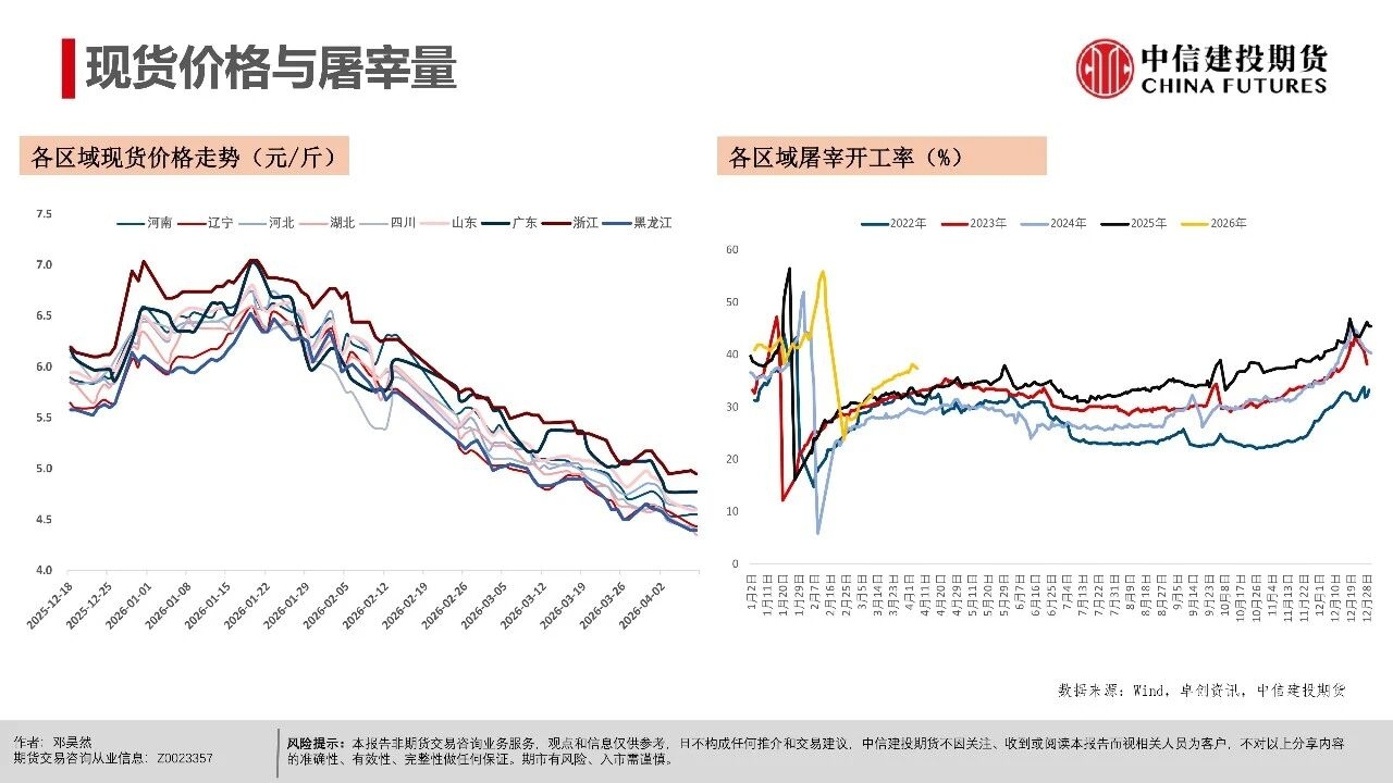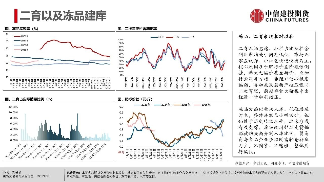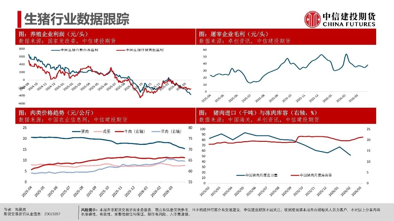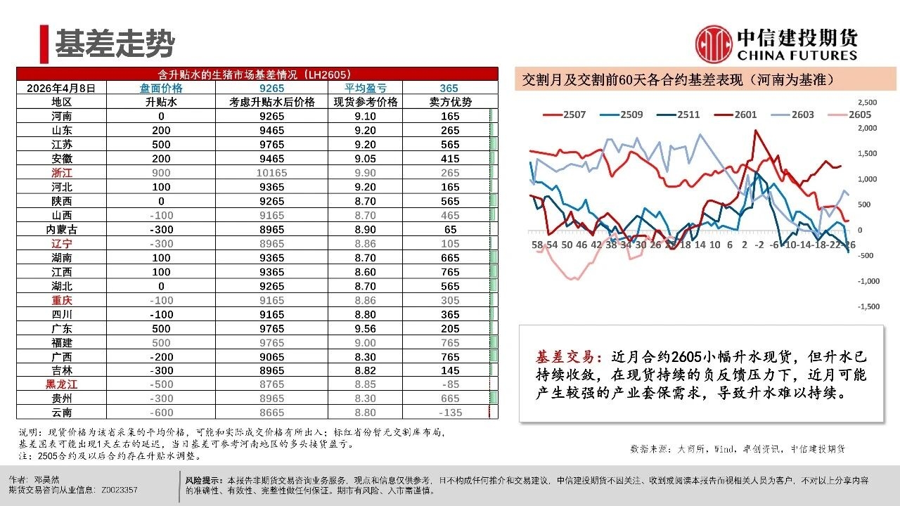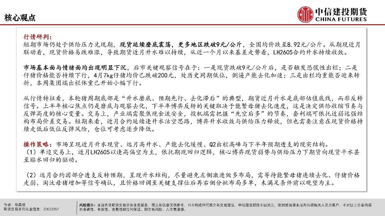 | 短期市场仍处于供给压力兑现期,现货延续磨底震荡,更多地区跌破9元/公斤,全国均价跌至8.92元/公斤。从期现近月联动看,现货价格易跌难涨,导致期货近月升水难以持续,从近一个月以来基差走势看,LH2605合约升水持续收敛。 市场基本面与情绪面均出现明显下沉,后市关键观察信号在于:一是现货跌破9元/公斤后,是否触发恐慌性出栏;二是仔猪价格能否持续下行,4月7kg仔猪均价已跌破200元,处历史同期低位,倒逼产能去化加速;三是出栏均重能否迎来转折,本周集团端出栏体重已开始小幅下行。 从行情特征看,本轮猪周期底部是“升水磨底、预期先行、去化滞后”的典型,期货近月升水是底部估值底线,而非反转信号。上半年核心焦点仍是磨底与观察去化,下半年博弈反转的关键取决于能繁母猪去化速度,这是决定供给收缩节奏与反弹高度的核心变量。 交易上,产业端需聚焦现金流安全,投机端需把握“先空后多”的节奏,套利端可依托近弱远强结构布局价差交易。短期来看,近月合约延续逢升水沽空思路,博弈升水收敛与供给压力释放,但也需要注意在现货价格持续走低后低位反弹风险,仓位可考虑逐步降低。 操作策略: 市场呈现近月升水现货、远月高升水、产能去化缓慢、Q2出栏高峰与下半年预期透支的现实结构。 (1)单边交易上,近月LH2605以逢高偏空为主,依托期现回归逻辑,核心博弈现货弱势与供给压力下期货向现货平水甚至贴水回归的驱动。 (2)远月合约因部分透支反转预期,呈现升水结构,尽量避免左侧激进做多布局,需等待能繁母猪连续去化、仔猪价格走弱、淘汰母猪增加等信号确认,且价格回调至关键支撑位后再右侧分批布局多单,未满足条件前以观望为主。