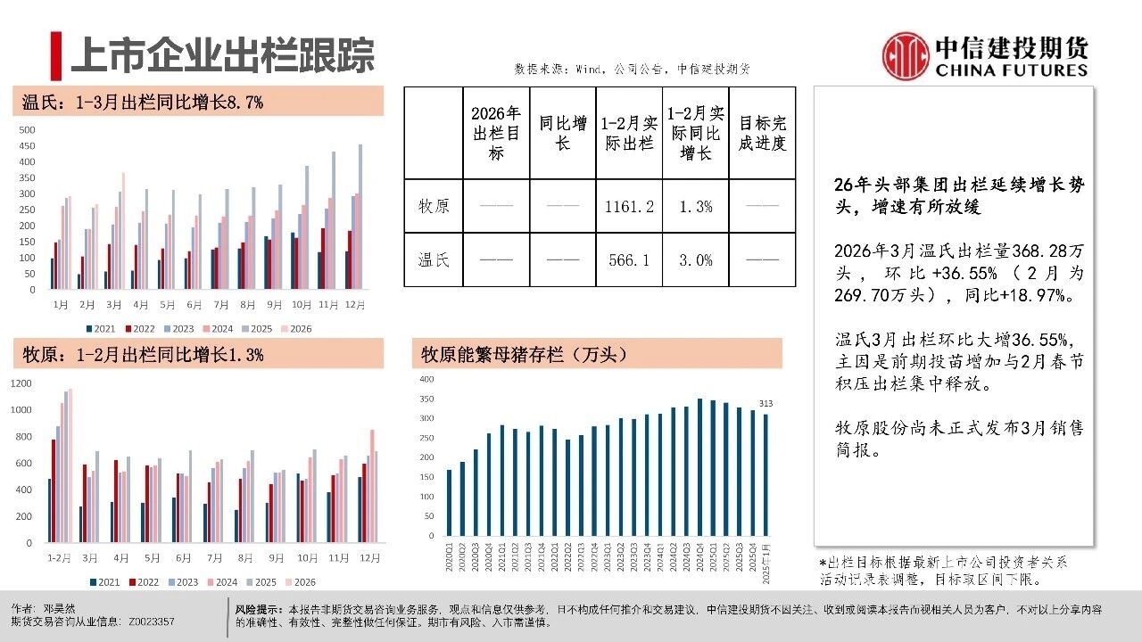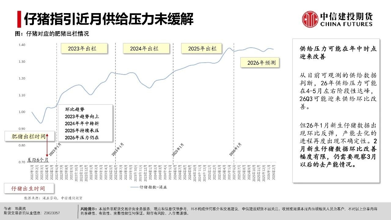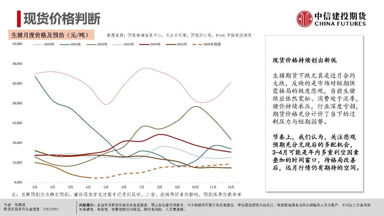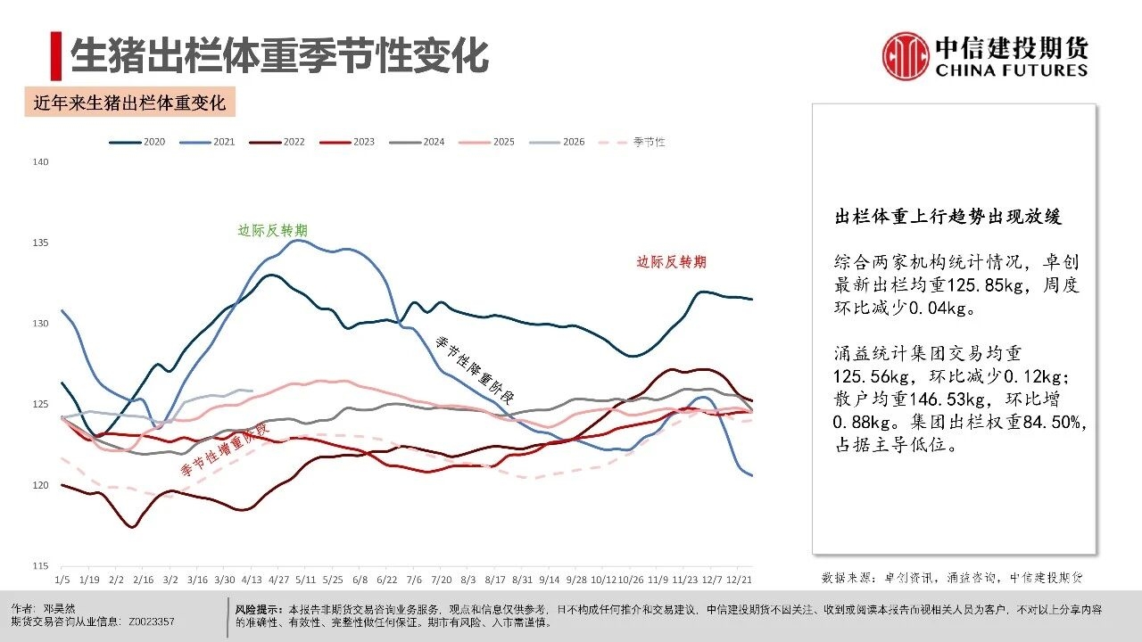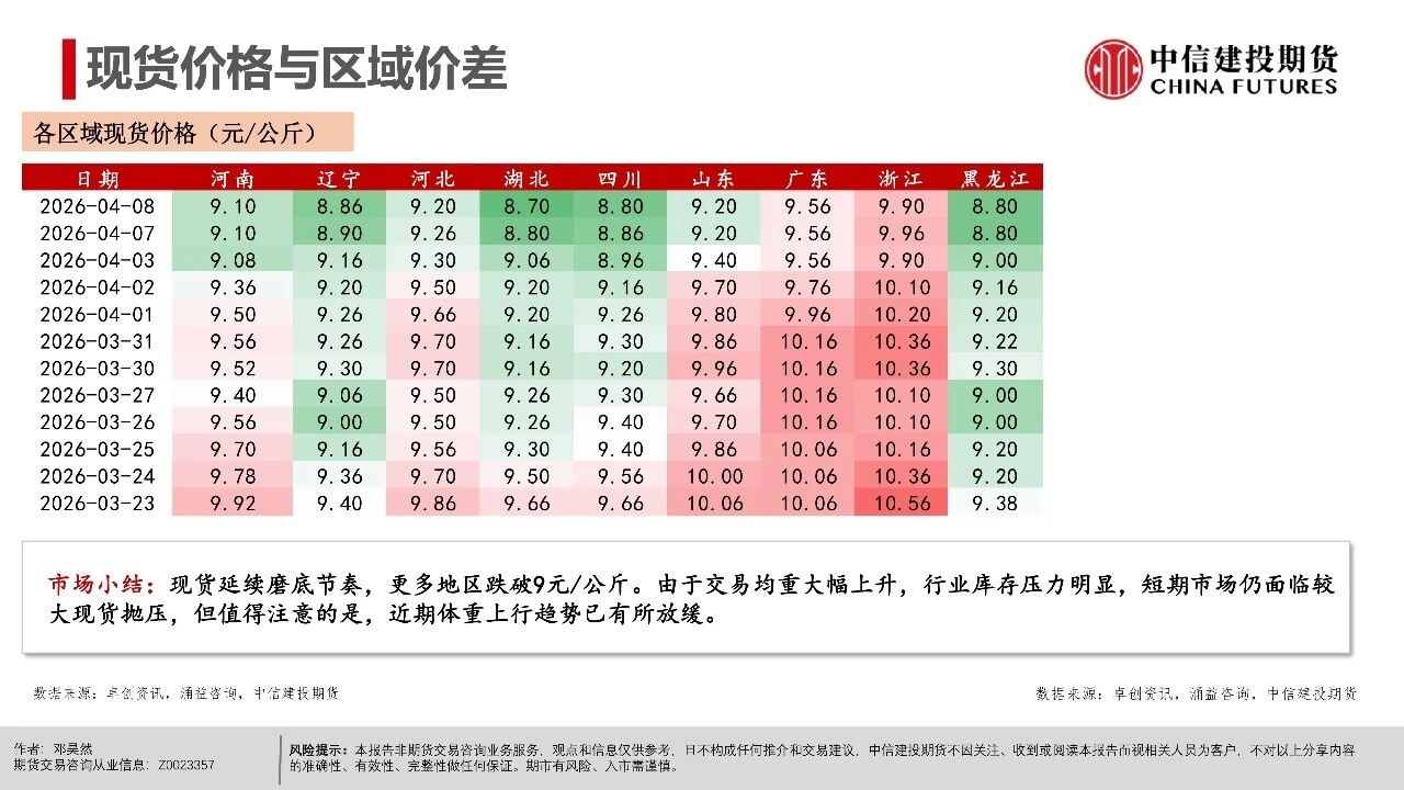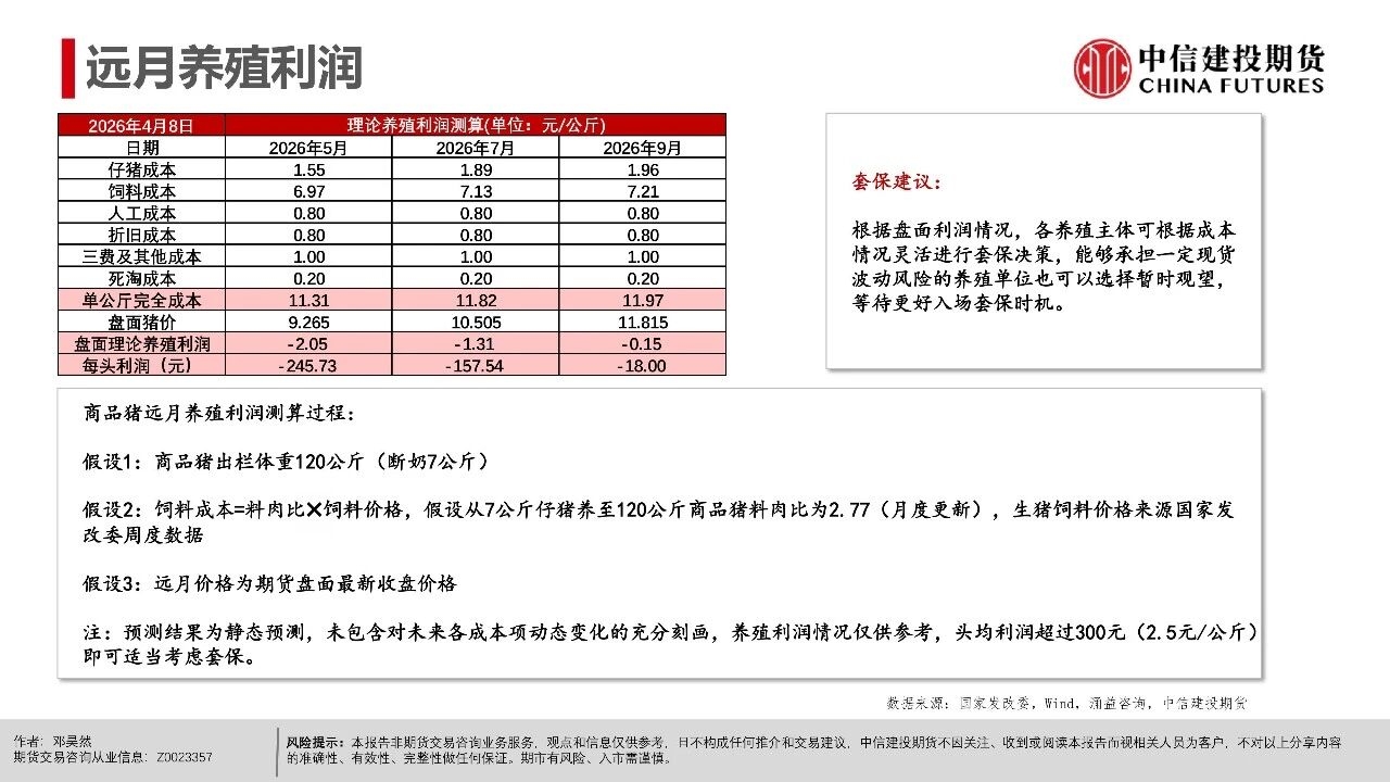| 短期市场仍处于供给压力兑现期,现货延续磨底震荡,更多地区跌破9元/公斤,全国均价跌至8.92元/公斤。从期现近月联动看,现货价格易跌难涨,导致期货近月升水难以持续,从近一个月以来基差走势看,LH2605合约升水持续收敛。 市场基本面与情绪面均出现明显下沉,后市关键观察信号在于:一是现货跌破9元/公斤后,是否触发恐慌性出栏;二是仔猪价格能否持续下行,4月7kg仔猪均价已跌破200元,处历史同期低位,倒逼产能去化加速;三是出栏均重能否迎来转折,本周集团端出栏体重已开始小幅下行。 从行情特征看,本轮猪周期底部是“升水磨底、预期先行、去化滞后”的典型,期货近月升水是底部估值底线,而非反转信号。上半年核心焦点仍是磨底与观察去化,下半年博弈反转的关键取决于能繁母猪去化速度,这是决定供给收缩节奏与反弹高度的核心变量。 交易上,产业端需聚焦现金流安全,投机端需把握“先空后多”的节奏,套利端可依托近弱远强结构布局价差交易。短期来看,近月合约延续逢升水沽空思路,博弈升水收敛与供给压力释放,但也需要注意在现货价格持续走低后低位反弹风险,仓位可考虑逐步降低。 操作策略: 市场呈现近月升水现货、远月高升水、产能去化缓慢、Q2出栏高峰与下半年预期透支的现实结构。 (1)单边交易上,近月LH2605以逢高偏空为主,依托期现回归逻辑,核心博弈现货弱势与供给压力下期货向现货平水甚至贴水回归的驱动。 (2)远月合约因部分透支反转预期,呈现升水结构,尽量避免左侧激进做多布局,需等待能繁母猪连续去化、仔猪价格走弱、淘汰母猪增加等信号确认,且价格回调至关键支撑位后再右侧分批布局多单,未满足条件前以观望为主。