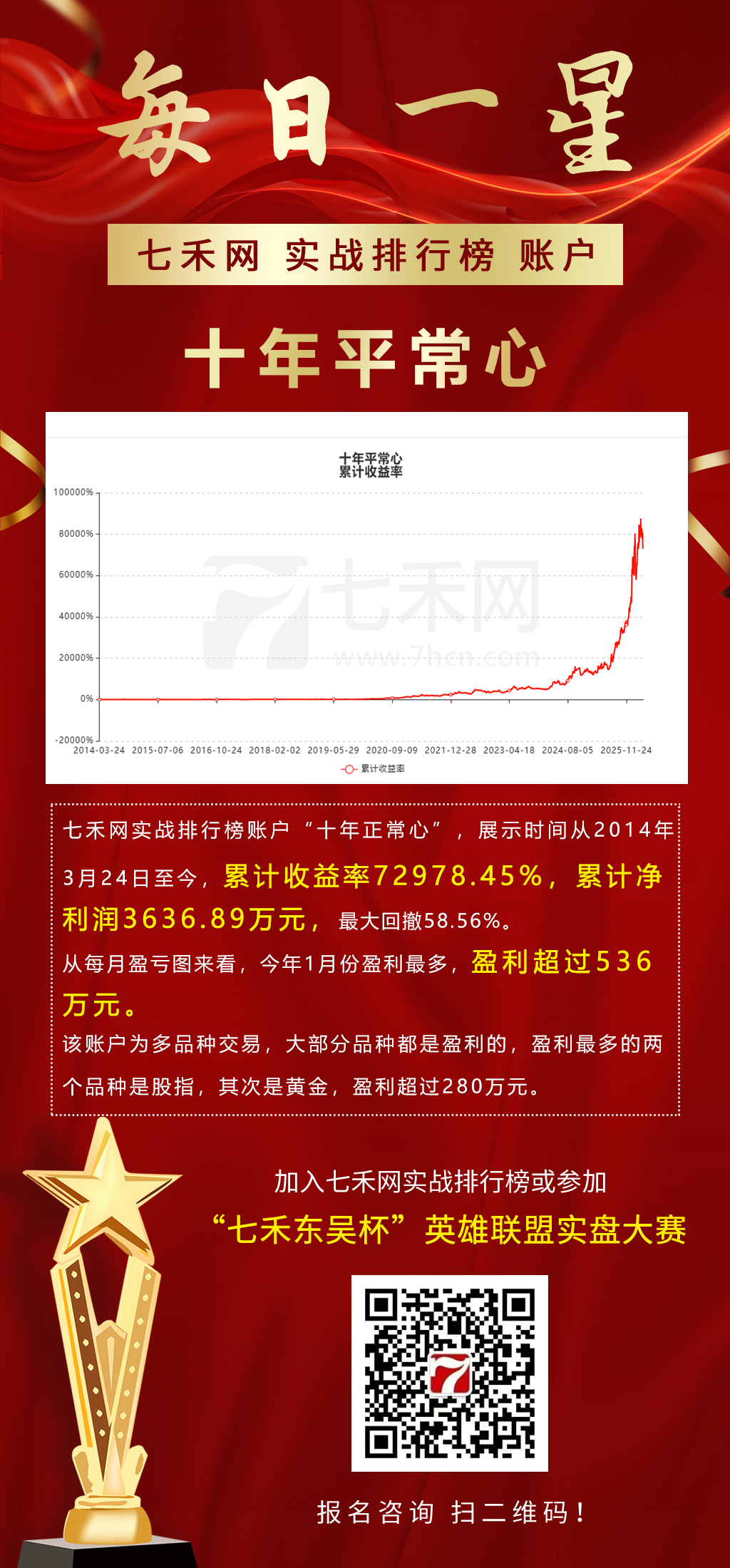 七禾网实战排行榜账户“十年正常心”,展示时间从2014年3月24日至今,累计收益率72978.45%,累计净利润3636.89万元,最大回撤58.56%。