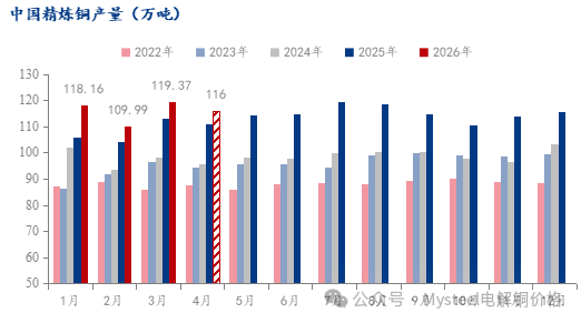 数据来源:Mysteel 另据调研企业的生产计划安排来看,2026年4月国内电解铜预计产量116万吨,环比减少2.82%,同比增加4.58%。1-4月国内电解铜预计产量累计为436.52万吨,同比增加6.85%。4月国内电解铜产量或迎来转折,出现环比下滑,主因进入二季度国内冶炼厂即将迎来检修高峰期,另外一季度部分冲量生产企业回归正常生产,对产量也有所影响;据Mysteel统计4月有8家冶炼厂处于检修或有检修计划,检修影响量达到4-5万吨,尽管有新投产冶炼厂产能逐步释放,但并不足与弥补冶炼厂检修影响,整体产出呈现收紧趋势,值得注意的是,检修影响将在5-6月进一步显现,达到年内峰值,届时产量或继续回落。