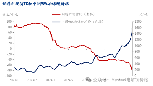 数据来源:Mysteel 3月电解铜产量表现显著增加,主因3月冶炼企业检修较少,据Mysteel统计3月有4家冶炼厂进行检修,检修影响单月产量有限;随着一季度结束,部分冶炼厂季度末冲量而加大产出;同时3月生产周期较长,因此较2月产量增加明显;另外冶炼硫酸价格大幅上涨至1500元/吨以上,极大弥补了铜精矿加工费亏损,因此纷纷维持高开工率。 据Mysteel调研来看,2026年一季度国内电解铜产量累计为347.52万吨,同比增加7.63%。一季度国内电解铜生产整体表现强劲,产量稳步增长,不过铜原料依旧制约冶炼厂产出,铜精矿价格TC持续走低,截至4月3日跌至-78美元/干吨附近,并且海外部分关键矿场的矿石品位下降,铜冶炼亏损持续扩大,加之再生铜市场波澜再起,由于行业政策的调整,市面再生铜票据较为紧张,一季度末部分再生铜票点已达到10%以上,加之铜价重心下移,导致市场流通货源有所收紧,再生原料供应减少使得冶炼厂原料紧张压力加剧。