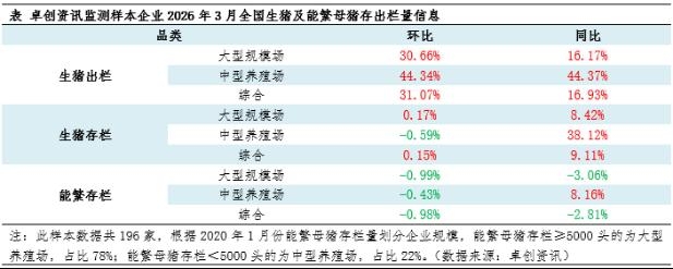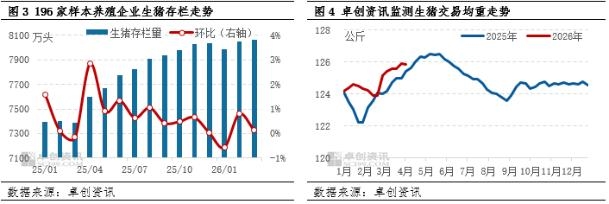 需求限制养殖端减重节奏 3月生猪存栏环比增加 卓创资讯监测196家样本养殖企业数据显示,3月份生猪存栏量环比增加。主要受前期产能充裕传导与阶段性出栏节奏变化影响。一方面,前期能繁母猪存栏相对充足,对应到3月形成充足的生猪接续供给,叠加养殖效率稳步提升,仔猪成活率与育肥猪存量相应增加。另一方面,3月份养殖端亏损,出栏积极性高位,需求端表现一般,下游消化力度不敌上游出栏力度,养殖端出栏节奏受限,整体出栏进度不及生猪新生补栏速度。除此之外,受需求限制,部分养殖端仍存在被动压栏现象,截至3月底,卓创资讯监测生猪交易均重为125.89公斤,同比增加0.74%,大猪消化进度偏缓。两方面导致生猪存栏总量呈现环比增加态势,与能繁母猪去化形成阶段性分化。
