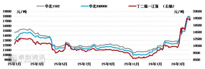 | 【导语】3月初中东地区的武装冲突,使得霍尔木兹海峡通航受阻,引发对全球原油及其下游产业供应稳定的担忧,推高原油及其下游的商品价格,连带合成橡胶产业也受到冲击。中东问题如果在4月无法尽快解决,合成橡胶价格或将持续偏强;但若达成和解协议,合成橡胶价格或顺势回调。 中东问题成为3月至今的市场主要上行驱动,合成橡胶月均价重心宽幅上移 3月初中东地缘问题爆发,霍尔木兹海峡立即处于实际封闭的状态,通航船只骤降,引发市场对与中东原油供应稳定的担忧,推高全球期货市场及现货市场原油价格。据了解全球约五分之一的原油与液化天然气通常每日经由霍尔木兹海峡运输,每日约2000万桶油当量的液体通过海峡,替代通道不足以完全对冲海峡关闭带来的冲击。WTI原油价格从2月27日收盘67.14美元/桶最高上涨到119.48美元/桶,上涨幅度达77.96%。原油价格走高推动下游炼油炼化行业的成本抬升,合成橡胶价格连带受到冲击。 合成橡胶价格走强源于原料丁二烯在此背景下的宽幅走高。随着地缘问题持续与全球原油供应减弱加深,连锁引发炼油炼化产业减产降负,中国、日本、韩国、欧洲以及美洲等多个区域的乙烯裂解装置、配套丁二烯装置及下游合成橡胶装置陆续出现停产降负现象。丁二烯市场价格从2月28日的10050元/吨附近上涨到3月最高18500元/吨附近,上涨幅度达84.08%。在成本的推动下,顺丁橡胶价格从2月28日的12550元/吨附近上涨到3月最高17800元/吨附近,上涨幅度达41.83%;丁苯橡胶价格从2月28日的12750元/吨附近上涨到3月最高17950元/吨附近,上涨幅度达40.78%。 丁苯、顺丁、及丁二烯价格走势