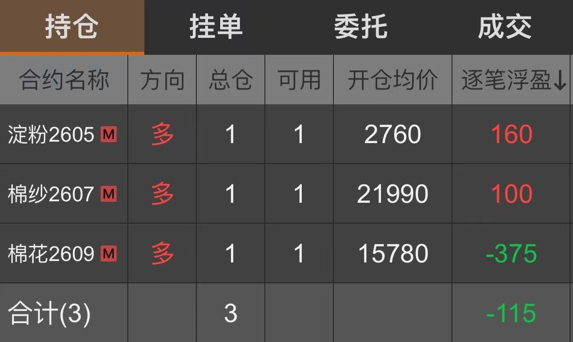 棉纱:2026年4月8日,达到启动点的开仓条件,所以在14:48开多一手棉纱2605合约,开仓价为21575。棉纱2605合约于2026年4月10日09:51移仓至主力合约2607,开仓价为21990。