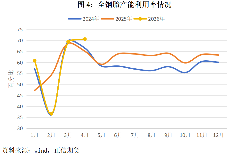 (二)需求端:刚需支撑不改,为胶价走强提供支撑 国内下游轮胎生产厂仍然按需采买,半钢胎、全钢胎开工负荷逐步回升,全钢胎开工率近三年新高。新能源汽车和重卡出口带动的配套轮胎需求持续向好,天然橡胶刚需支撑较为稳固。但此次云南休割属于阶段性供应扰动,目前国内天然橡胶去库不明显,下游加工企业仍以刚需采购为主。