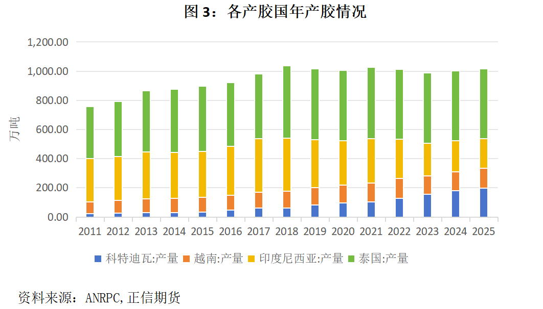 从全球天胶供给来看,今年全球天然橡胶预计呈供不应求态势,ANRPC数据显示全年供需缺口约40万吨,2025年全球天胶产量约1,485万吨,同比仅增0.3%,远低于历史平均增速;2026年初步预测产量1,478–1,482万吨,较前几年开始收缩,为近年少有的产量负增长。亚洲产区主产国泰国、印尼、马来西亚、越南均出现增产乏力。泰国、印尼等主产国受胶树老龄化、劳动力短缺影响增产乏力,国内云南产胶区的减产扰动,会进一步加剧全球供应端的阶段性紧张,非洲新兴产区的产能增量,或对国内缺口形成部分对冲,但总体应该无法覆盖减产带来的缺口。
