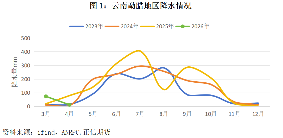 | 一、热点事件 2026年4月初,云南省勐腊县勐捧农垦有限责任公司发布〔2026〕1号休割通知,受持续干旱天气影响,区域内降水严重偏少,部分橡胶林出现黄叶、落叶现象,橡胶产量显著下降。公司决定自通知下发之日起,对所有割胶林段全面停止割胶作业,具体恢复开割时间将结合天气变化及树体恢复情况另行通知,同时要求各收胶点同步开展环境卫生清洁、收胶仪器保养维护等工作。