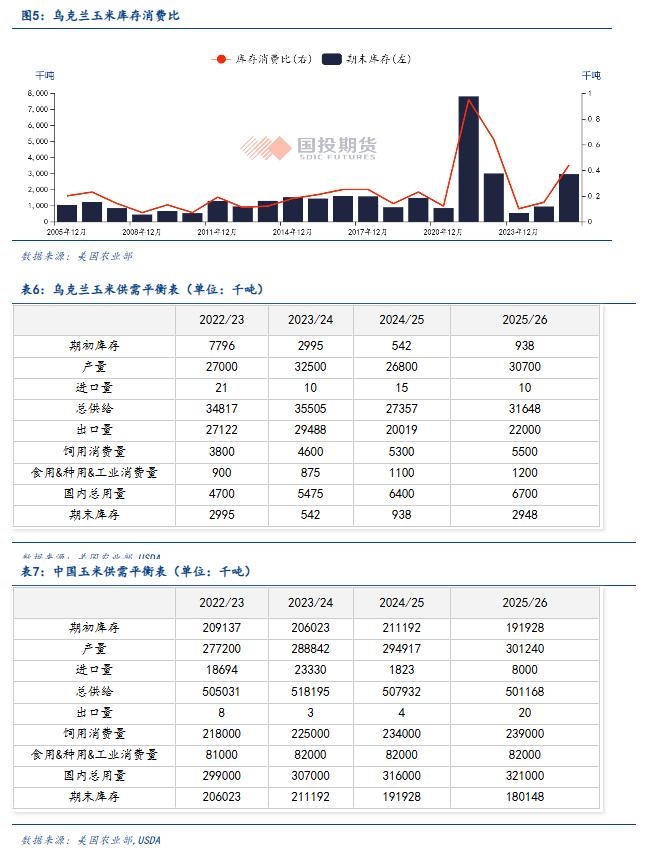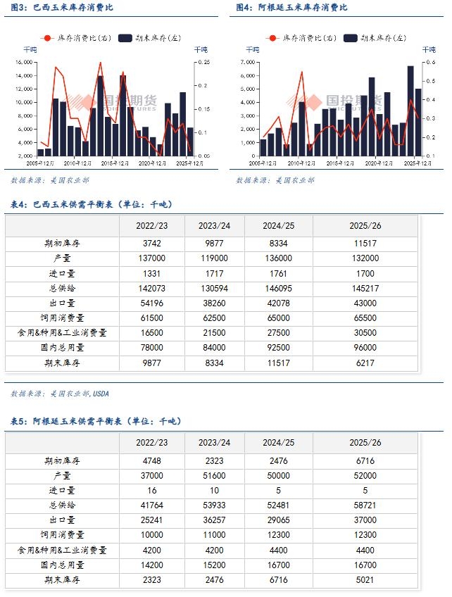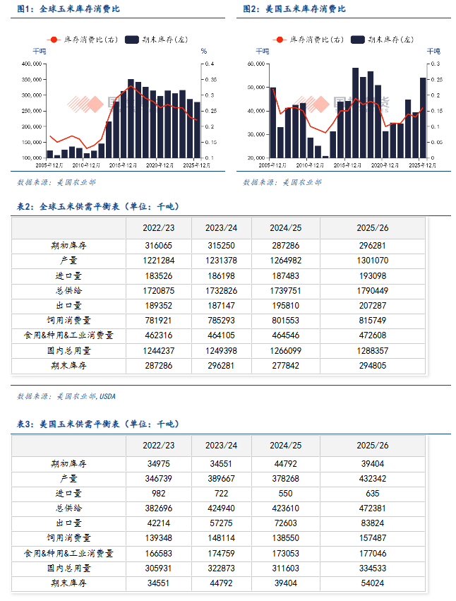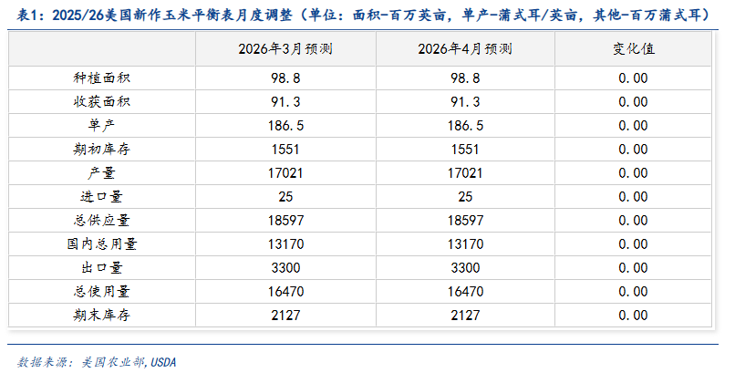 | 美玉米未做调整,短期价格受能源价格影响大 北京时间4月10日凌晨,美国农业部发布4月农产品供需报告。报告显示,美玉米数据整体未做调整。一般来说4月报告不会在关键数据做出重大调整,每年5月的月度供需报告,会首次利用3月31日发布的“种植意向报告”的数据发布新年度供需报告(2026/27),投资者需重点关注。今日报告发出前,从路透预测数据来看,美玉米期末库存预测平均值为21.28亿蒲式耳,实际公布数据未调整,为21.27亿蒲式耳,基本符合预期。报告发布后,市场反响较为平淡。 全球方面,2025/26年度全球玉米产量为13.0107亿吨,较上一年度增加了6969万吨,较3月预测值增加了363万吨。其中印度、南非、印度尼西亚和俄罗斯的产量有所增长,但乌拉圭的产量有所下降。印度产量增加是基于其政府最新报告中的种植面积增加,南非的产量增加是由于充沛的降雨,导致种植面积和单产的双重提高。2025/26 年度全球主要贸易变化包括印度、俄罗斯和南非的玉米出口预计增加,而巴基斯坦和乌拉圭的出口预计减少。库存方面,2025/26市场年度全球玉米期末库存增加至2.9481亿吨,报告前机构预期值为2.9307亿吨,3月预估值为2.9275亿吨,略超预期。 总的来说,前期国际原油价格上下波动较大,作为美国燃料乙醇的主要原材料,美玉米价格跟随原油价格波动幅度较大,短期影响大于基本面。但美玉米产量新高,虽然本季美玉米出口预期强劲,可期末库存的绝对数据21.27亿蒲式耳仍处于历史较高水平。未来美玉米回归基本面后,或还将在底部震荡运行。