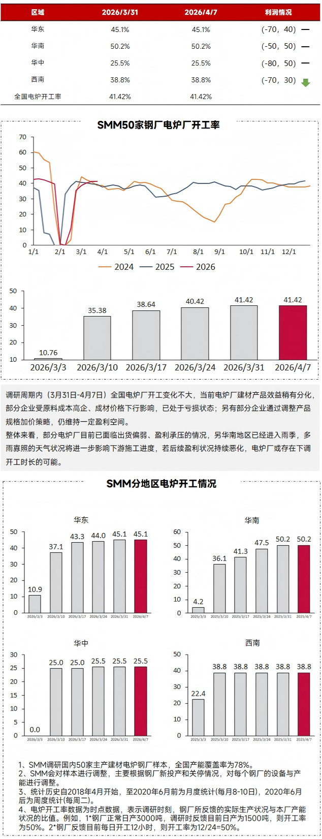 | 报告品种:螺纹钢 原文链接:https://mp.weixin.qq.com/s/LvtL-vtOo2M0rNidVNxw5Q?scene=1&click_id=1 截至4月7日,全国50家主产建材的电炉钢厂开工率为41.42%,环比上期持平;产能利用率42.6%,环比上期持平;建材日均产量9.49万吨,环比上期持平。 调研周期内(3月31日-4月7日)全国电炉厂开工率整体保持平稳,波动不大。当前电炉企业建材产品效益稍有分化,部分企业受原料成本高企成材价格下行影响,已处于亏损状态,另有部分企业通过调整产品规格加价策略,仍维持一定盈利空间。 整体来看,部分电炉厂目前已面临出货偏弱、盈利承压的情况,另华南地区已经进入雨季,多雨寡照的天气状况将进一步影响下游施工进度,若后续盈利状况持续恶化,电炉企业或存在下调开工时长的可能。