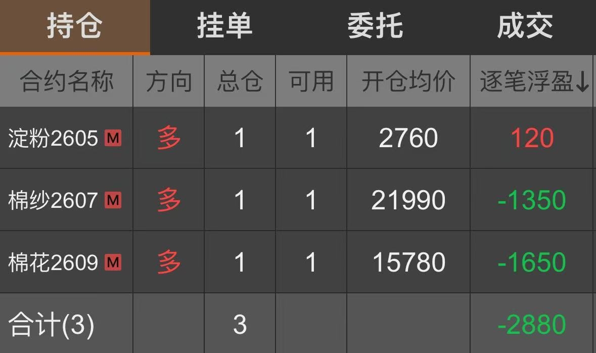 | 一、开仓总结 棉纱:2026年4月8日,达到启动点的开仓条件,所以在14:48开多一手棉纱2605合约,开仓价为21575。棉纱2605合约于2026年4月10日09:51移仓至主力合约2607,开仓价为21990。 淀粉:2026年4月9日,达到启动点的开仓条件,所以在14:44开多一手淀粉2605合约,开仓价为2760。 棉花:2026年4月10日,达到启动点的开仓条件,所以在14:45开多一手棉花2609合约,开仓价为15780。 二、平仓计划 棉纱:达到启动点的平仓止损/止盈条件,在收盘前或下一个交易日开盘后全部平仓。 淀粉:达到启动点的平仓止损/止盈条件,在收盘前或下一个交易日开盘后全部平仓。 棉花:达到启动点的平仓止损/止盈条件,在收盘前或下一个交易日开盘后全部平仓。 注:本交易总结由第三方提供,只作为投资理念和方法的交流,不作为七禾网的观点,也不作为投资参考和建议。 附: 1、交易者简介 十年股票/期货/外盘交易经验,每年都实现投资盈利。 擅长微观盘面分析和宏观市场分析,总结了数套有效的盈利模式,和众多高手有深入交流,收益良好。 2、持仓截图