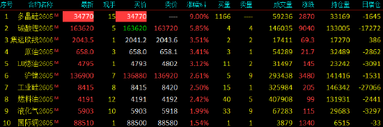 | 2025年4月13日,国内期货主力合约涨跌不一。多晶硅触及涨停,涨9%,碳酸锂涨超5%,集运欧线、SC原油、低硫燃料油(LU)主力合约涨超3%,工业硅、沪银涨超2%;跌幅方面,烧碱跌超3%,丁二烯橡胶跌超2%,20号胶、生猪、橡胶、苹果、棕榈油、PTA跌超1%。