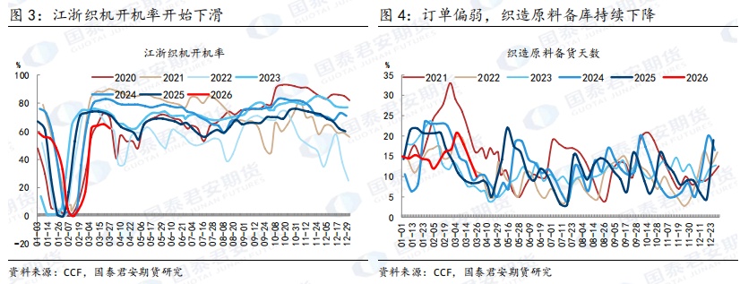 然而,内需市场同样面临着消费复苏不及预期的问题。2026年农历春节时间较晚,另外3月份受天气异常波动影响,终端动销缓慢,品牌商下单也极为谨慎,多以小单、快反单为主。目前在产的订单转为这种结构性的补位,并不能完全填补外需留下的缺口,最终将导致4月份织造开工下降。 三、织造环节:高波动下的极致观望与减产前兆 在需求端疲软的同时,上游聚酯原料价格的剧烈波动,更是让下游织造工厂陷入了极度的恐慌与观望之中。 1、价格波动引发的“赖单”恐惧 我们在与萧山地区的织造老板交流时,他们提到了一个核心痛点:“现在不敢下单,不是没钱,是怕价格跌。”今年以来,聚酯原料的价格波动频率和幅度都远超往年。短短一个月内,涤纶长丝的价格波动幅度可以达到2000-3000元/吨。这种高频的波动,让下游客户患上了“恐高症”。 工厂普遍担心,如果在价格高位接了原料、接了订单,一旦后续原料价格回落,下游的坯布价格必然跟着下跌。而原本下单的客户很可能会因为价差过大而选择弃单。这种情况在去年的几轮价格暴跌中已经上演过,很多工厂因此赔了货款又积压了库存。因此,为了规避这种风险,绝大多数工厂选择观望。 2、极低库存备货:仅维持到清明 这种观望情绪直接体现在了原材料的备货周期上。调研数据显示,目前绝大多数织造工厂的原料库存都极低,基本只采购了够用到清明节前后的量,也就是1-2周的生产用量。这意味着,过了清明节,如果市场没有明显好转,这些工厂将面临无米下锅的局面。 更关键的是,目前市场上鲜有新的订单进来。工厂手里的旧单消化完了,新单接不到,那下一步就只能停机。我们了解到,目前江浙地区已经有部分小型喷水织机厂开始计划停车检修,尤其是那些资金实力较弱、抗风险能力差的小企业。