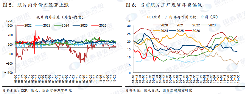 3、产能出清:现买现做亏损倒逼行业洗牌 在极度观望的市场氛围下,行业的产能出清正在加速进行。这已经不是简单的季节性减产,而是一轮优胜劣汰。 过去几年,由于原料价格持续下跌、波动率相对稳定,很多中小工厂习惯了“现买现做”的模式,即接到订单才去买原料,做完就交货,几乎不留库存。这种模式在价格下跌市场、平稳市场可以规避库存风险,但在当前的剧烈波动市中,却变成了亏损的陷阱。 当前如果严格按照“现买现做”,工厂的加工费已经覆盖不了成本,长期处于亏损状态。因为原料价格涨的时候,买原料贵了,但坯布价格涨不上去;原料价格跌的时候,坯布跌得比原料还快,高价买的原料又造成加工费亏损。两头挨打的局面,让这种零库存模式彻底失效。 4、备货能力决定生存权 能踩准价格节奏,在低位囤积原料的工厂能够获得更大的竞争优势。那些资金实力雄厚、对行情判断准确的大厂,往往能在价格低谷期大量备货。这样一来,他们的原料成本远低于市场平均价,即便坯布价格稍有下跌,他们依然能够保有一定的现金流。 而那些始终不敢备货、坚持现买现做的工厂,成本相对较高。长此以往,这些工厂就会陷入“没订单-不敢备货-更没订单”的死循环,最终只能面临无生意可做、被迫关停的局面。调研中我们发现,下游工厂开工率不断下降,这其实是市场在自发地调节产能,试图匹配当前已经萎缩的需求体量。过去几年织机等产能的无序扩张,2026年将是艰难的产能出清之年。 四、聚酯环节风险:现金流紧绷与贸易商违约隐忧 随着下游拿货意愿的下降,聚酯工厂的出货变得越来越困难。虽然部分工厂开始减产,但聚酯库存的累积速度依然超过了去化速度。这直接导致了聚酯工厂的现金流状况走差。为了回笼资金,很多工厂不得不采取“高低配货”的销售策略。 在聚酯产业链中,最脆弱的环节莫过于小型瓶片贸易商。瓶片市场价格波动极大,而且很多贸易商都是高杠杆操作。在过去两年瓶片供应过剩的情况下,贸易商普遍采取超卖的操作,日子过得很滋润。但一旦价格转向,现货价格暴涨,他们手里没有囤足库存,需要高价采购现货来交付,资金链瞬间就会断裂。由于传统瓶片贸易商习惯直接超卖远期现货,对上下游的保证金只有10%且行业没有追保习惯,高波动下的尾部风险很大。 瓶片工厂宣布不可抗力加剧瓶片贸易环节的信用风险,目前仍未充分释放。3月以来多家瓶片工厂由于原料价格上涨宣布不可抗力,瓶片需求又恰逢旺季。内需主要的下游饮料、食用油工厂都正常提产;出口方面由于亚洲其它国家炼化与化工产业相较中国更加脆弱,国际市场给出更多的溢价,瓶片内外价差突破2023年以来的常规区间大幅上升,也促使工厂把更多现货资源转向利润更好的出口订单,加剧内贸环节的现货紧张。此外,当前停工的瓶片装置不少是从去年开始就长期在执行减产或检修,由于没有提前采购原料,即使现在现货加工费已经数周维持在1000元/吨以上,工厂通过提产来平衡短期供需的潜力并不大。目前虽然工厂一手单的提货仍总体正常,但内贸贸易商环节的现货紧缺,以及连带发生链式反应般违约的风险并未解除,可能会持续整个4月。