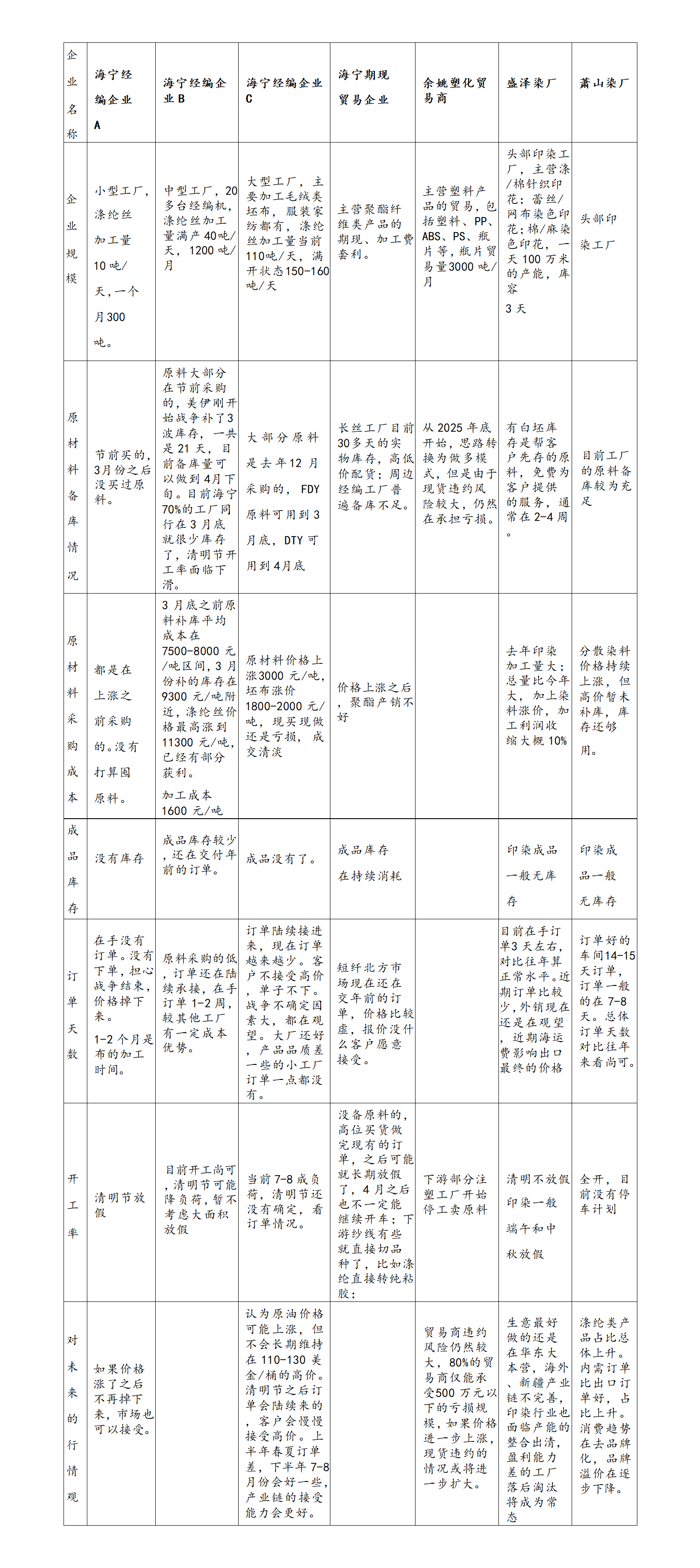 | 报告品种:PX、PTA、MEG、短纤 原文链接:https://mp.weixin.qq.com/s/QiE-hBOm6VU1dKtHlSFawg 2026年3月23日至24日,我们前往海宁、绍兴、萧山及余姚等地,对经编、印染、聚酯原料贸易及瓶片贸易等环节的重点企业进行了实地走访与深度交流。本次调研正值传统的“金三银四”旺季,但市场却呈现出与往年截然不同的冷清景象。外部地缘冲突引发的物流扰动、国际海运费的非理性上涨,以及上游原材料价格的剧烈波动,共同交织成了一张复杂的压力网,自上而下地传导至产业链的每一个环节。 通过与多家龙头及中小型企业负责人的座谈,我们发现,当前产业链正处于一个较为脆弱的博弈平衡点。终端需求的萎缩倒逼织造环节集体观望,而上游原料端在成本与库存的双重压力下,减产预期虽已升温但尚未完全落地。整个市场在“等待需求复苏”与“等待供应收缩”之间反复拉扯,导致价格传导机制暂时失效,形成了典型的“供需双减”格局。 需求结构变化:受中东地区物流及海运费上涨影响,纺服外需萎缩,内需订单被动补位但高价之下总体疲软,清明节期间多数工厂面临停工。原料价格高波动,下游转为观望,工厂原料备货仅维持到清明节(1-2周)。 产能出清加速:现买现做模式长期亏损,备货能力成为生存分水岭,中小产能淘汰正在加速匹配萎缩的需求。 信用风险累积:聚酯产品销售高低配货现象普遍,小型瓶片贸易商违约风险显著上升。 后市展望:3月底至4月初不建议追高,等待4月中旬上游原料检修进一步落地,供应收缩后,有望重启正反馈行情。 一、调研背景与概述 2026年3月23日至24日,我们前往浙江地区的海宁、绍兴、萧山及余姚等地,对经编、印染、聚酯原料贸易及瓶片加工等环节的重点企业进行了实地走访与深度交流。 本次调研正值传统的“金三银四”旺季,但市场却呈现出与往年截然不同的冷清景象。外部地缘冲突引发的物流扰动、国际海运费的非理性上涨,以及上游原材料价格的剧烈波动,共同交织成了一张复杂的压力网,自上而下地传导至产业链的每一个环节。 二、家纺服装:外需萎缩下的内需补位 在本次调研中,多数企业提到了出口订单的快速下滑。往年的3-4月份,正是欧美、中东市场为夏季备货的高峰期,出口订单往往是工厂订单的大头。然而今年,这一景象并未出现。 受中东地缘局势持续紧张的影响,霍尔木兹海峡关闭、同时红海航线的通行效率大幅下降,有部分船只可通过绕行好望角,这直接导致了海运周期的拉长,海运费方面,尽管需求明显萎缩,但原油燃料油大幅上涨,船东运输成本大幅上涨,反而带动了运费的上涨。 与此同时,海外品牌商自身也面临着高库存的压力。目前欧美零售商的库存销售比仍处于高位。春节前原料价格总体低位,部分出口订单1-2月放量,海关出口数据仍有韧性,但3-4月服装类出口预计回落,劳动密集型消费品出口同比转负,显示出外需的真实疲软。