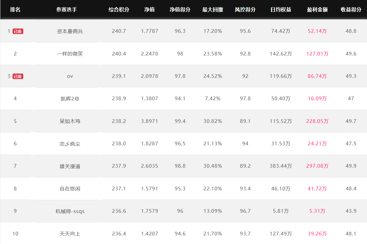 奖金上不封顶 特定期货公司参赛奖金翻倍 优秀选投 每周选优秀选手对接资金 达标必投 单笔最多给1个亿管理型资金 管理型资金盈利分成20%~70% 免费培训/研报/调研/咨询 诚邀您参赛! 为了促进国内期货市场交易人才的发展和成熟,七禾网举办本次“期货CTA英雄联盟”实盘大赛&超级服务,招募优秀的操盘手,为优秀的交易人才搭建桥梁! 第四届大赛圆满结束,第五届荣耀开启,欢迎参赛!第五届大赛已于2025年7月1日开赛,火热报名中,比赛过程中持续接受报名,大赛奖金&管理型资金&超级服务,等你来领! 2023年2月16日后,在主办方指定的几家期货公司中的某一家C公司新开户参赛,享奖金翻倍! 在主办方指定的几家期货公司中的某一家B公司新开户参赛,享奖金翻倍! 大赛中的优秀选手,只要在大赛中有3个月及以上的实盘业绩,主办方将每周发送优秀参赛者的业绩、资料给合作的数十家资方,供其考察是否投管理型资金。至2022年8月12日,资方已选出23名优秀投顾,累计投入超5.5亿元管理型资金。 优秀选投:通过主办方及资方考核后,将获得管理型资金(资金来源:七禾网自有资金(买优秀选手的基金产品)、七禾网股东、数十家合作资方) 在主办方指定的几家期货公司中的某一家B公司新开户参赛,以及2023年2月16日后,在主办方指定的几家期货公司中的某一家C公司新开户参赛,可以按照:“达标必投”进行考核(将给予单笔100万元~1亿元的管理型资金,分红比例20%~70%),详细规则请联系微信:15858201632 大赛综合排名前10名 2026.4.13
