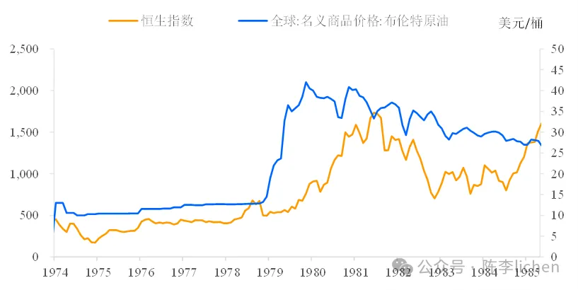 三,股票市场爆发。恒生指数从1979年初的500点左右,到1981年夏季触及约1810点的阶段性顶峰,涨幅超过 260%。 以长江实业为例,1980-1981年期间,其股价复权后上涨了4倍,从4.7元港币涨到30元港币(除权前)。在频繁的融资和并购推动下,其市值从1978年的不足10亿港币上涨到1981年高峰期间的60亿港币。公司利润从 1978 年的1.33亿港元爆发式增长至1981年的13.85 亿港元,四年内翻了十倍。 恒指与油价的“逆行”走势▼
