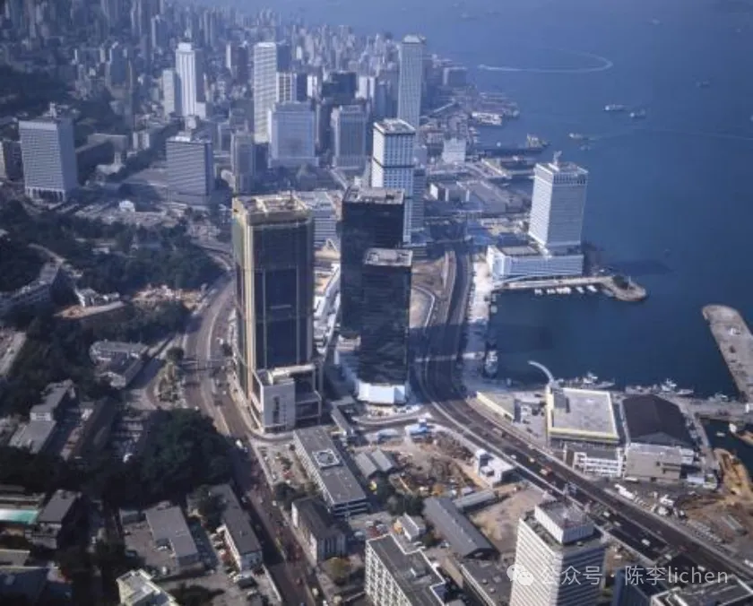 在西方主要经济体哀鸿遍野、陷入衰退泥潭时,远在东亚的香港却走出了截然不同的、近乎“超现实”的独立行情。 香港的反常牛市——从土地到股市都在上涨 在这种极端恶劣的外部环境下,香港呈现出一种反直觉的繁荣: 一,惊人的GDP表现。这一时期,香港的名义GDP增长率与实际GDP增长率呈现出一种“双高”态势,名义增长完全覆盖了成本支出的上涨: 1979年:名义GDP增长25.3%,实际增长11.5%; 1980年:名义GDP增长25.8%,实际增长10.1%; 1981年:名义GDP增长25.9%,实际增长9.2%。 二,土地与房地产的飙升。在极高的名义增长刺激下,土地成为了最炽热的资产配置目标。1979 年至 1981 年间,香港私人住宅价格指数翻了一番。1980 年 8 月,金钟一块土地(现远东金融中心所在地)以每平方英尺超过 1.5 万港元的价格成交,创下当时的世界纪录。 1980年代的港岛金钟地区,几幢大楼耸立在低矮楼群之间▼