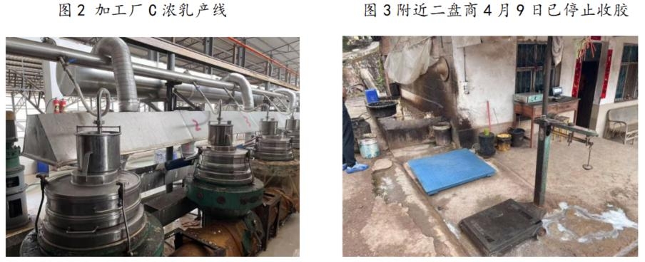 数据来源:国家统计局、云南统计局 加工情况:西双版纳的橡胶初加工厂有78家,其中规模以上橡胶加工企业39家,生产的产品包括SCR WF(交割品)、浓乳胶、SCR5、SCR10、SCR20、TSR5、TSR10、TSR20、TSR9710等。天然橡胶5年综合加工总量518.53万吨,年均增长10%以上。 3、调研行程 1、时间:2026年4月7日-4月11日; 2、调研路线:云南西双版纳景洪、勐腊。 4、调研详情 勐腊加工厂A (1)企业运营情况 性质:民营企业。 产品:SCR WF、TSR9710、TSR20。 产能:15万吨。 新增产能:老挝新增2万吨产能,主产绉片胶,进口到国内加工成成品。 产量:2025年年产8万吨。 开工情况:胶水产出偏少,收胶困难拖累开工。 (2)原料和库存情况 开割情况:降水偏少导致目前胶水产出偏少,泼水节后会大面积开割。 原料来源:目前有自营橡胶基地1.5万亩。 原料库存:1000吨左右,主要是年关补货的库存。 (3)企业观点 订单情况:9710以直接对接销售国内主流轮胎企业为主。 替代指标:自身没有替代指标。 市场判断:物候正常,不算特别干旱,判断今年原料供应没有太大问题,预计云南增产1-2万吨;对价格相对乐观,认为原料不好跌。 勐腊加工厂B (1)企业运营情况 性质:民营企业。 产品:SCR WF、TSR9710、TSR20。 产能:B加工厂产能4.5万吨;B加工厂属于B公司,B公司在云南共5个加工厂,主要集中在勐腊,普洱地区,此外老挝有2个加工厂。 新增产能:虽无在建,但由于浓乳利润持续乐观,公司计划明后年在勐腊其它地区上浓乳产线,但最大的问题是土地和环评问题。 产量:2025年全乳产量0.6万吨左右,9710产量1.4万吨左右。 开工情况:共计两条水线,目前开一条、停一条,开工维持5成。 (2)原料和库存情况 开割情况:8日下午政府下发黄色高温预警,预计明天(4月9日)继续停割。 原料来源:以当地原料为主,境外原料使用较少;没有自己的橡胶园区,原料获取相对被动,以二盘商为主。 原料库存:一星期左右。 (3)企业观点 订单情况:全乳主要是进入交割库,9710 等由总公司统一运营销售。 生产利润:去年整体维持六个点利润。 市场判断:当前价格下胶农割胶积极性较强;今年物候条件算近5-6年最好的一年,虽然前期稍有干旱,但预计2026年产量整体维稳。 勐腊加工厂C (1)企业运营情况 性质:民营企业。 产品:浓乳、TSR9710、TSR10、混合胶。 产能:20台离心机,2万吨/年。 新增产能:5月会再上20台离心机。 产量:2024年干胶1万吨,浓乳0.9万吨。 开工情况:目前乳胶生产线满负荷运转,乳胶产量60吨/天。 (2)原料和库存情况 开割情况:4月8日晚降雨后无法割胶,今日(4月9日)无新胶产出。 原料来源:以附近二盘商为主。 原料库存:有限,附近供货的二盘商4月9日已停止收胶。 原料价格:昨日(4月8日)加工厂收胶在16.8元/公斤。 成品库存:以销定产,目前乳胶成品库存0.2万吨左右,生产出来陆续发往终端企业,基本不做库存。 (3)企业观点 订单情况:订单情况比较稳定,浓乳主要销往四川,重庆等西南客户,干胶一般交付下游轮胎企业和贸易商,贸易商占比多一些。 市场判断:目前浓乳利润高,需求情况也不错,其中发泡市场内卷严重,手套需求相对稳定,乳胶丝需求增长显著;浓乳行业目前情况虽不及公共卫生事件时期,但利润依然可观。