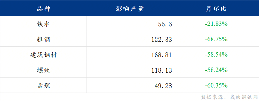 测算显示,本轮减产检修影响3月份铁水产量55.6万吨,环比减少21.83%;影响粗钢产量122.33万吨,环比减少68.75%;影响建筑钢材产量168.81万吨,环比减少58.54%,其中影响螺纹钢产量118.13万吨,环比减少58.24%;影响线盘产量49.28万吨,环比减少60.35%。